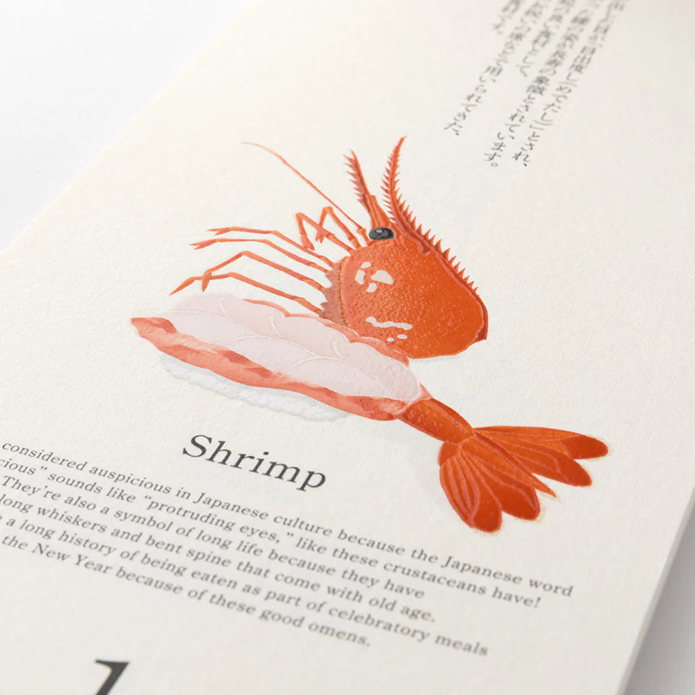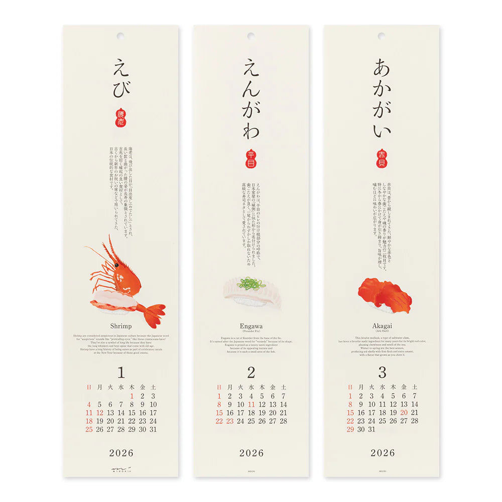 The Midori 2026 Echizen Wall Calendar Sushi is a silk printed calendar made from hand-torn washi paper, using bright colors and spot gold paint. It features 12 sheets, each depicting an onigiri sushi with a description. It gives you a taste of Japan !