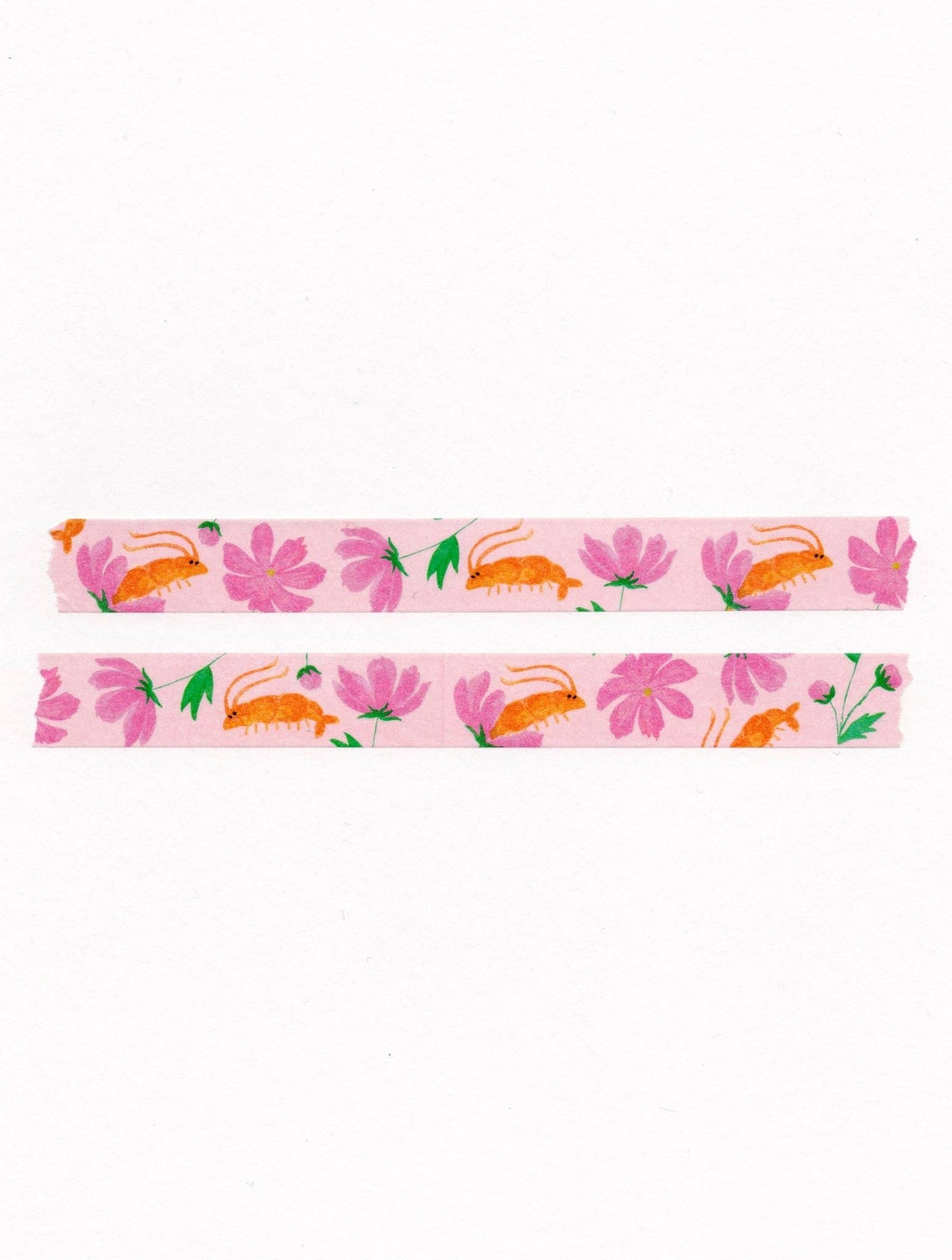 It seems that a little shrimp named Nini has been spotted foraging among flowers... 🌸🦐 Embark on a bucolic stroll with this decorative washi tape, sprinkled with pink cosmos flowers and Nini the shrimp, bringing the scent of spring! Perfect for poetic lovers, journaling enthusiasts, scrapbooking, and creative hobbies. Your bullet journals, notebooks, cards, scrapbooking albums, and other DIY projects will thank you! 100% cuteness guaranteed! DETAILS: * Width: 15 mm | Length: 10 meters * Material: Japanese washi adhesive paper * Packaging: in plastic with a circular sticker