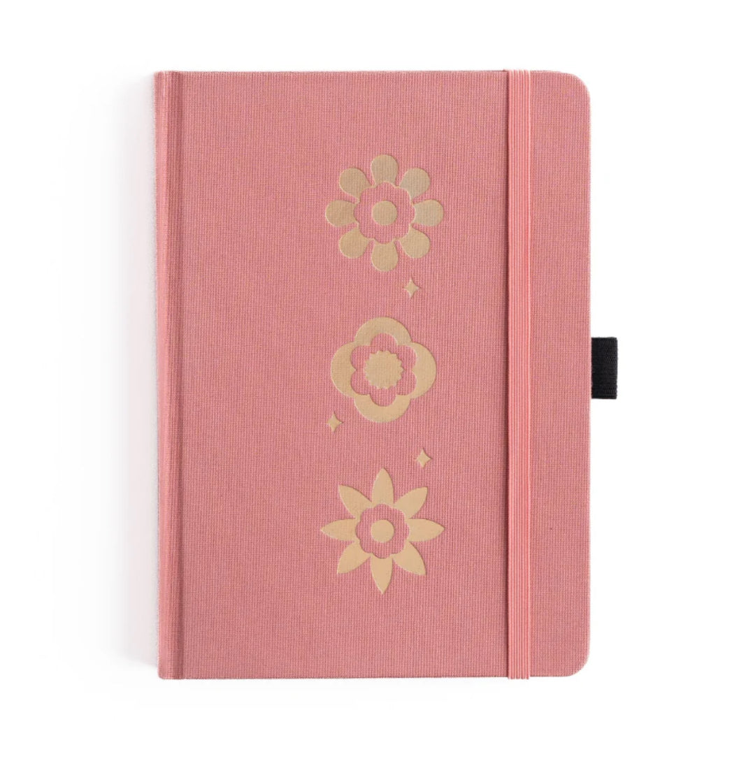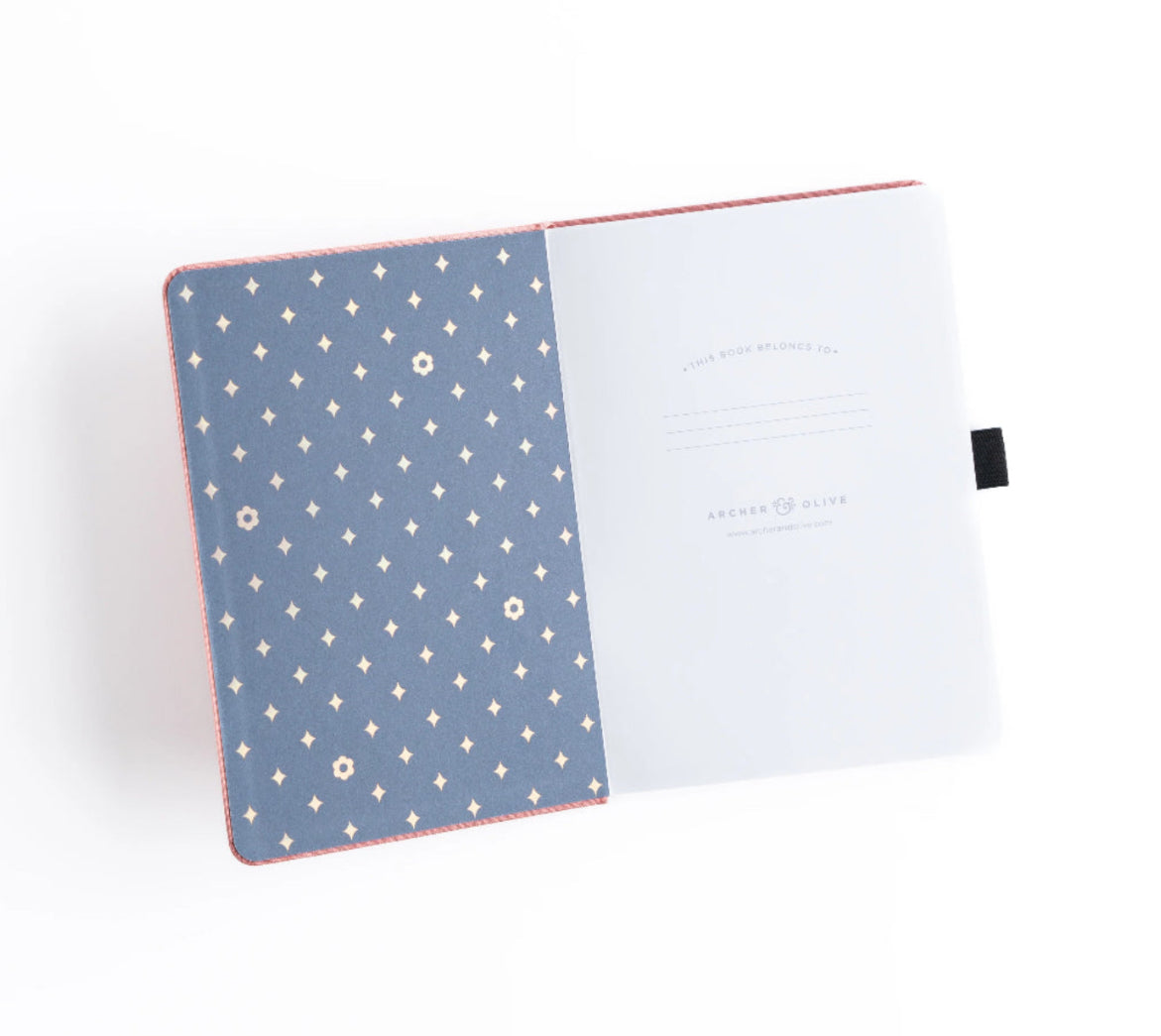 This Archer & Olive Flower Trio Dot Grid Notebook features three bold flowers stamped in holographic silver foil on a pink linen cover. This notebook has a special floral detail on the back cover, with a bold navy diamond and daisy pattern on the inside cover.