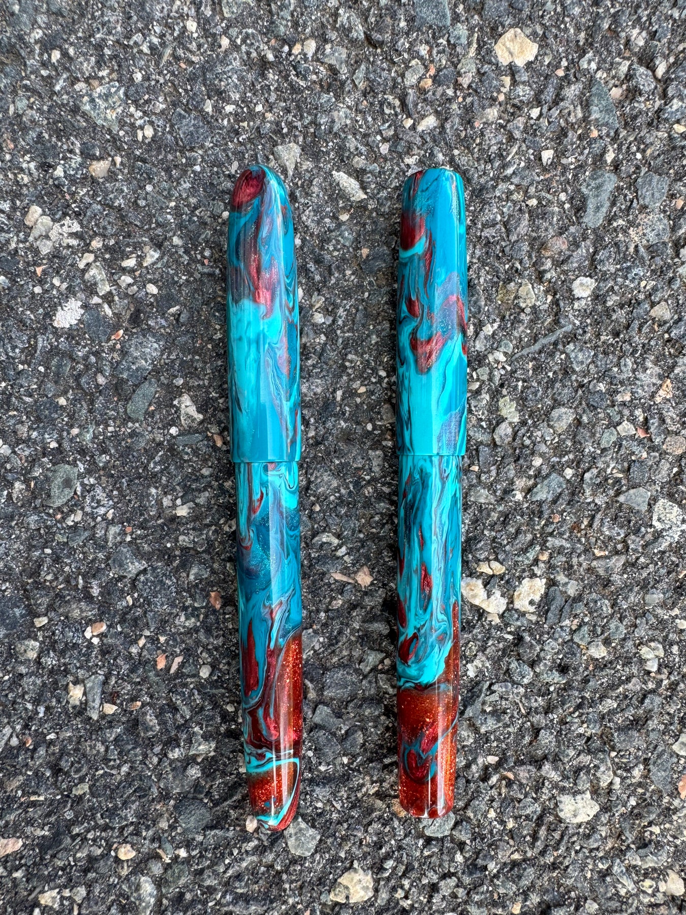 This fountain pen was created from custom in house Alumilite resin blanks and turned on a lathe. The cap and body have triple start threads.