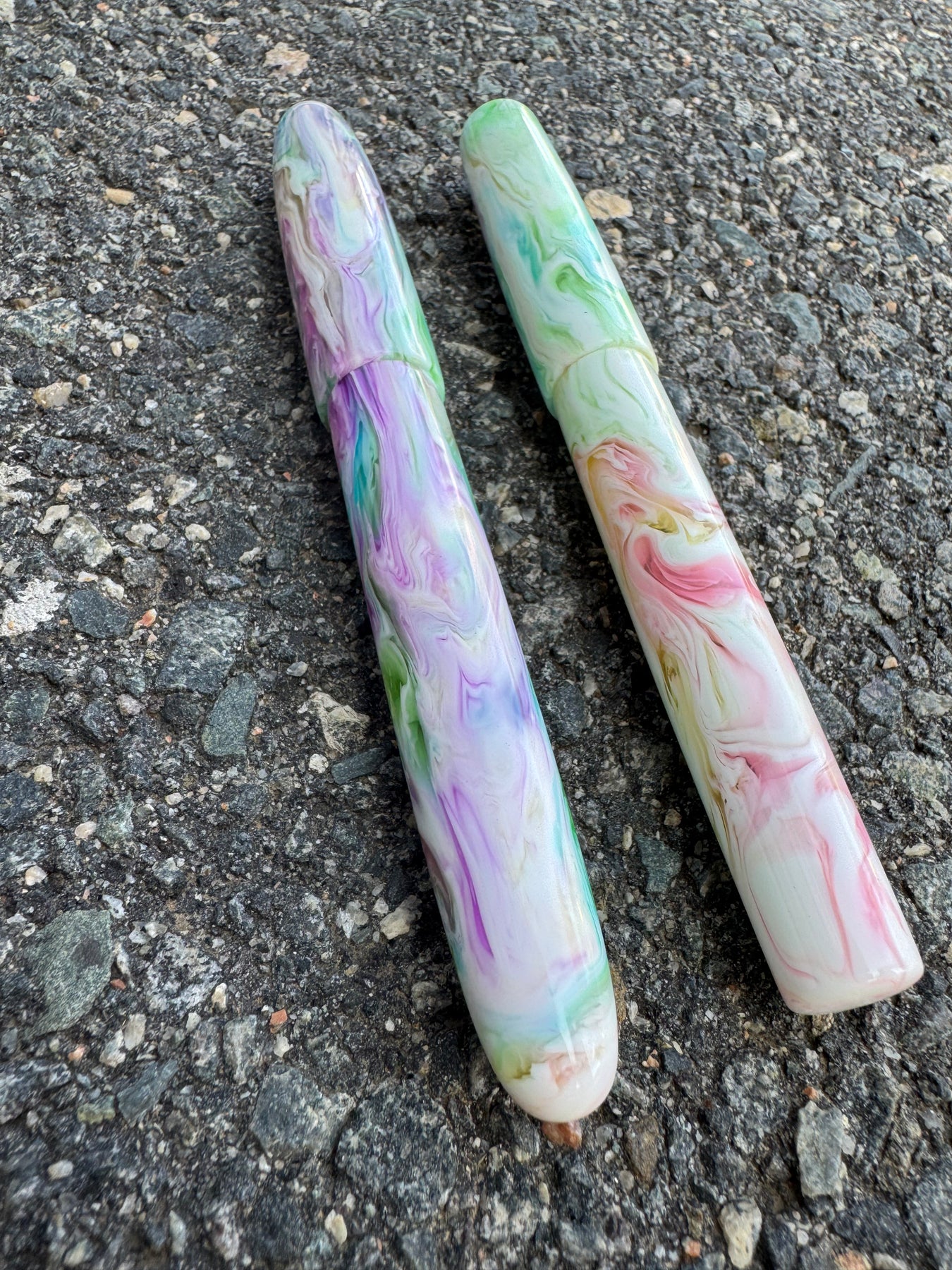 This fountain pen was created from custom in house Alumilite resin blanks and turned on a lathe. The cap and body have triple start threads.