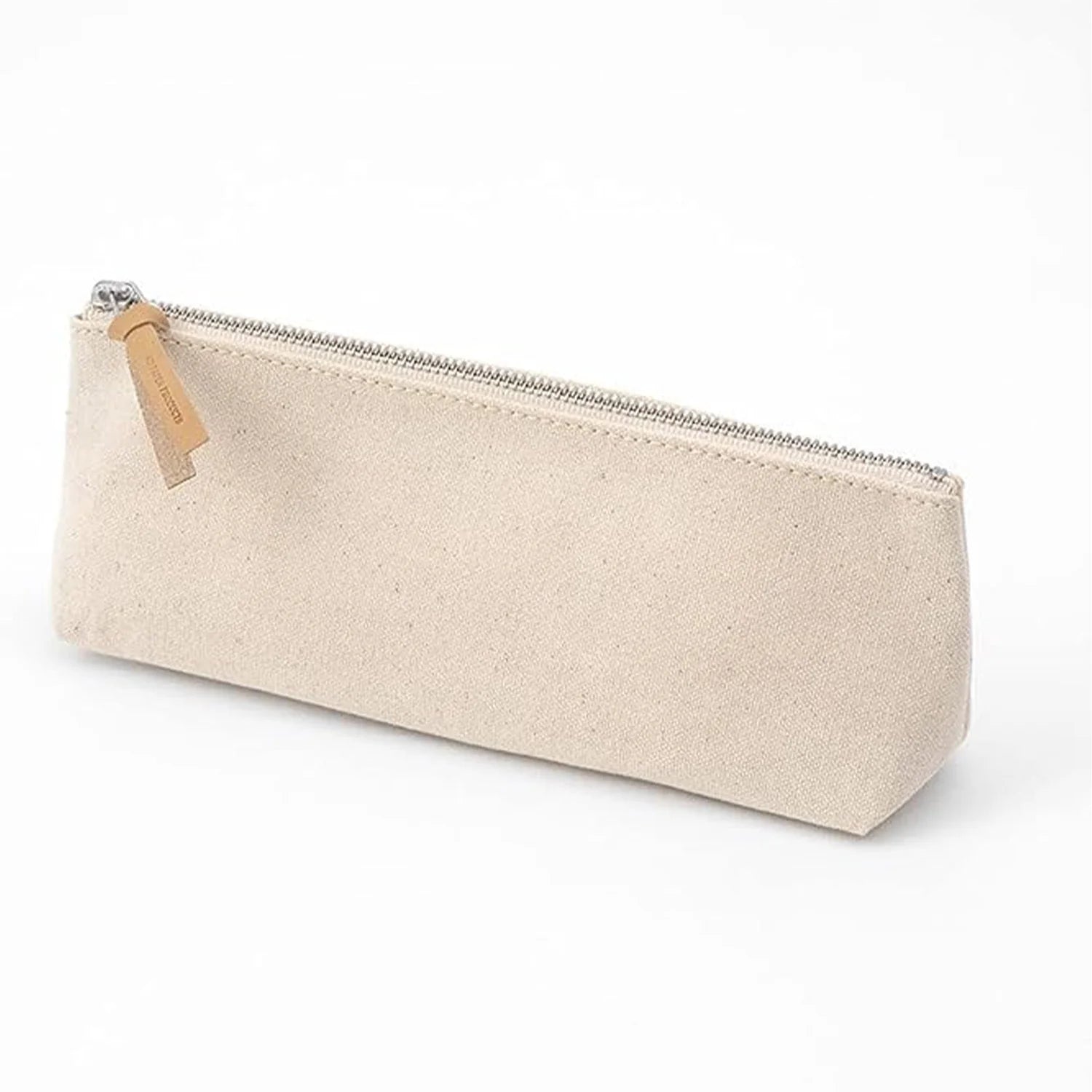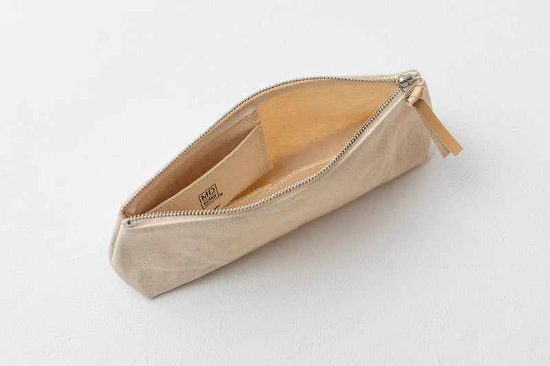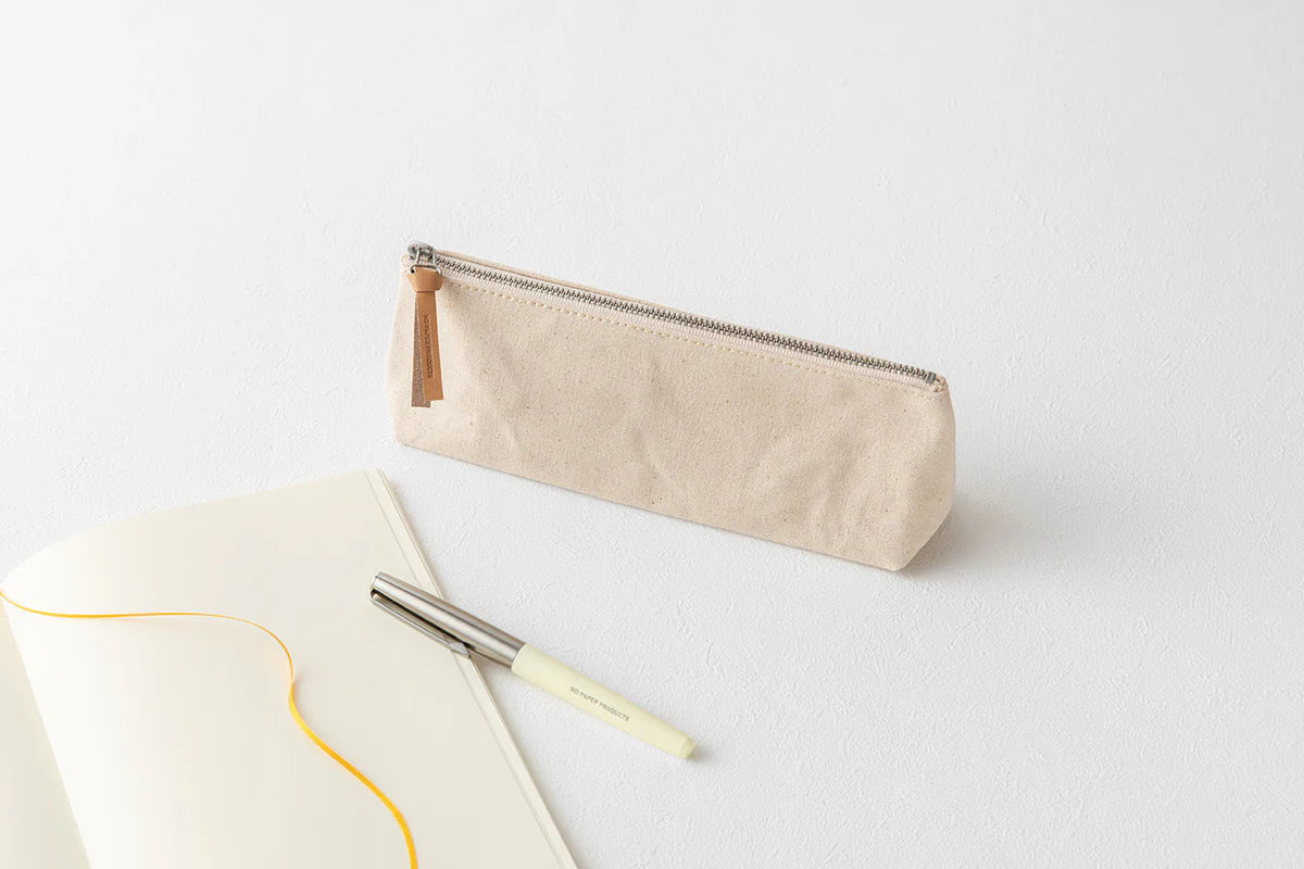 The Midori MD Pen Case, made from durable Kurashiki Canvas, is a spacious case designed to hold writing tools while elegantly retaining its shape. The canvas material, known for its use in sails and tarps, boasts a water-repellent wax finish for superior durability and water resistance, and it softens with use over time. The case also features a cow leather zipper pull with the MD logo, which softens and shines with use, and a small inner pocket that keeps small items like refills or an eraser.