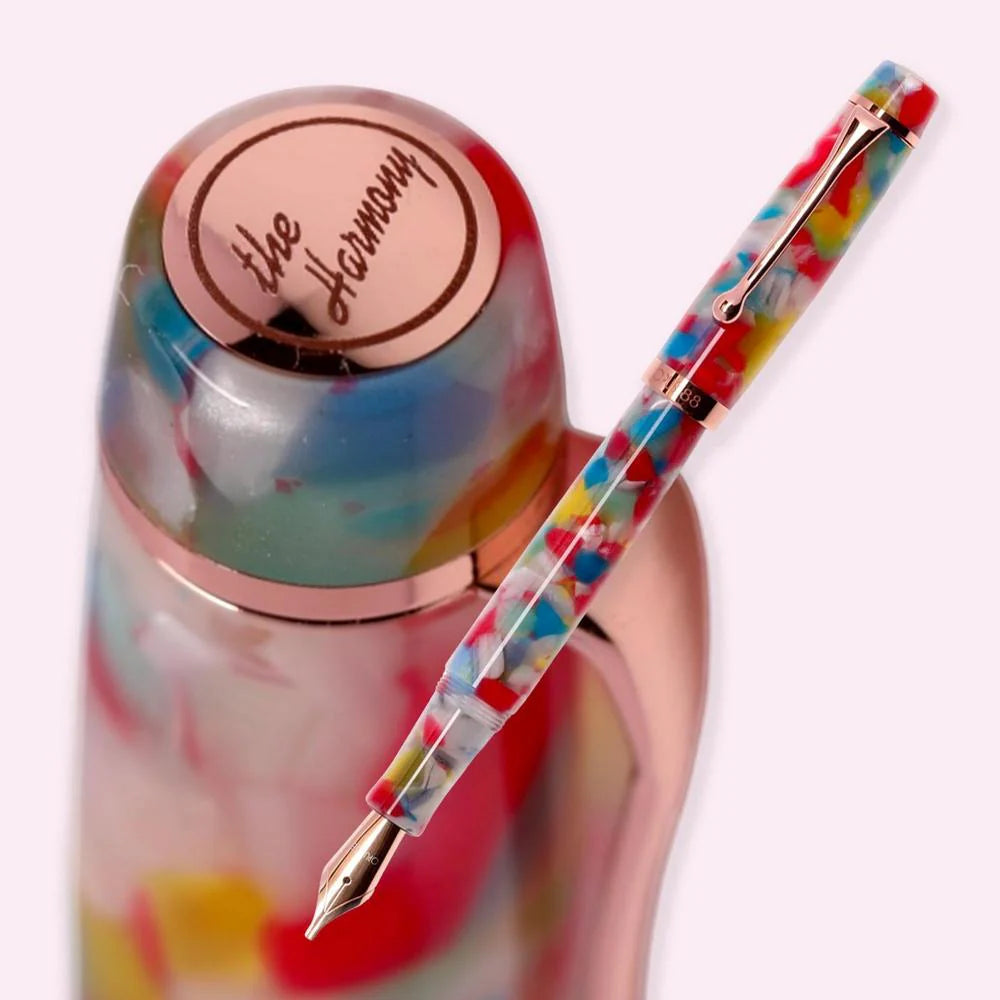 The Opus 88 Harmony fountain pen is a truly unique writing instrument. The Harmony is an eyedropper-filled pen with a piston operated shut-off valve.