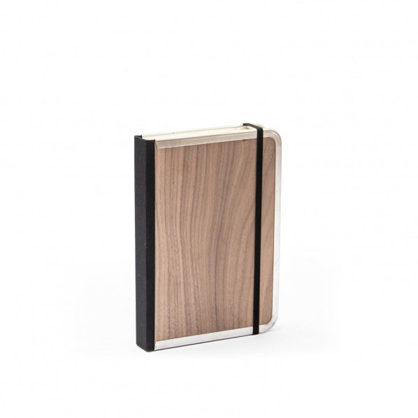 This notebook is a stunner-walnut or cherry wooden cover with a metal edge and a black elastic band, 144 dot grid sheets.