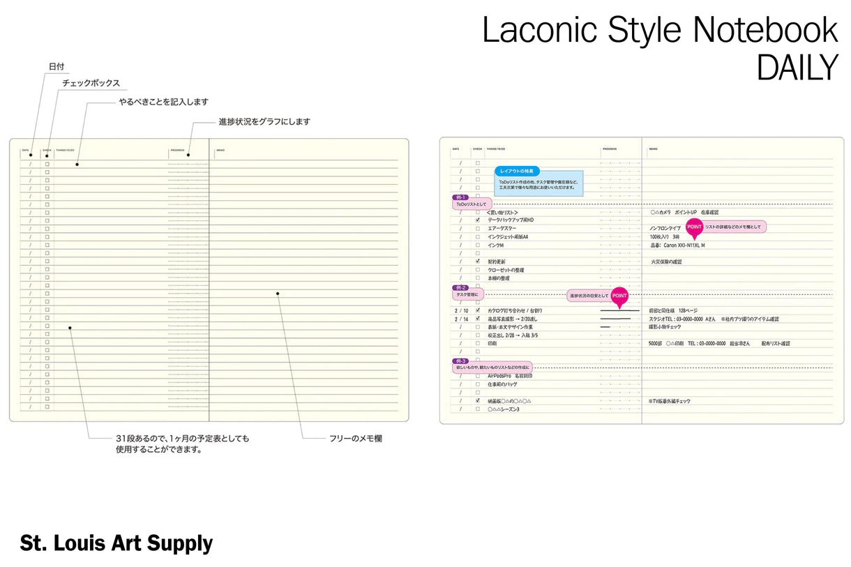 The Laconic Style Notebook Series features ten slim volumes with different types of content to organize your life. Stay on-task and well-prepared with a layout that suits your work and personal life.