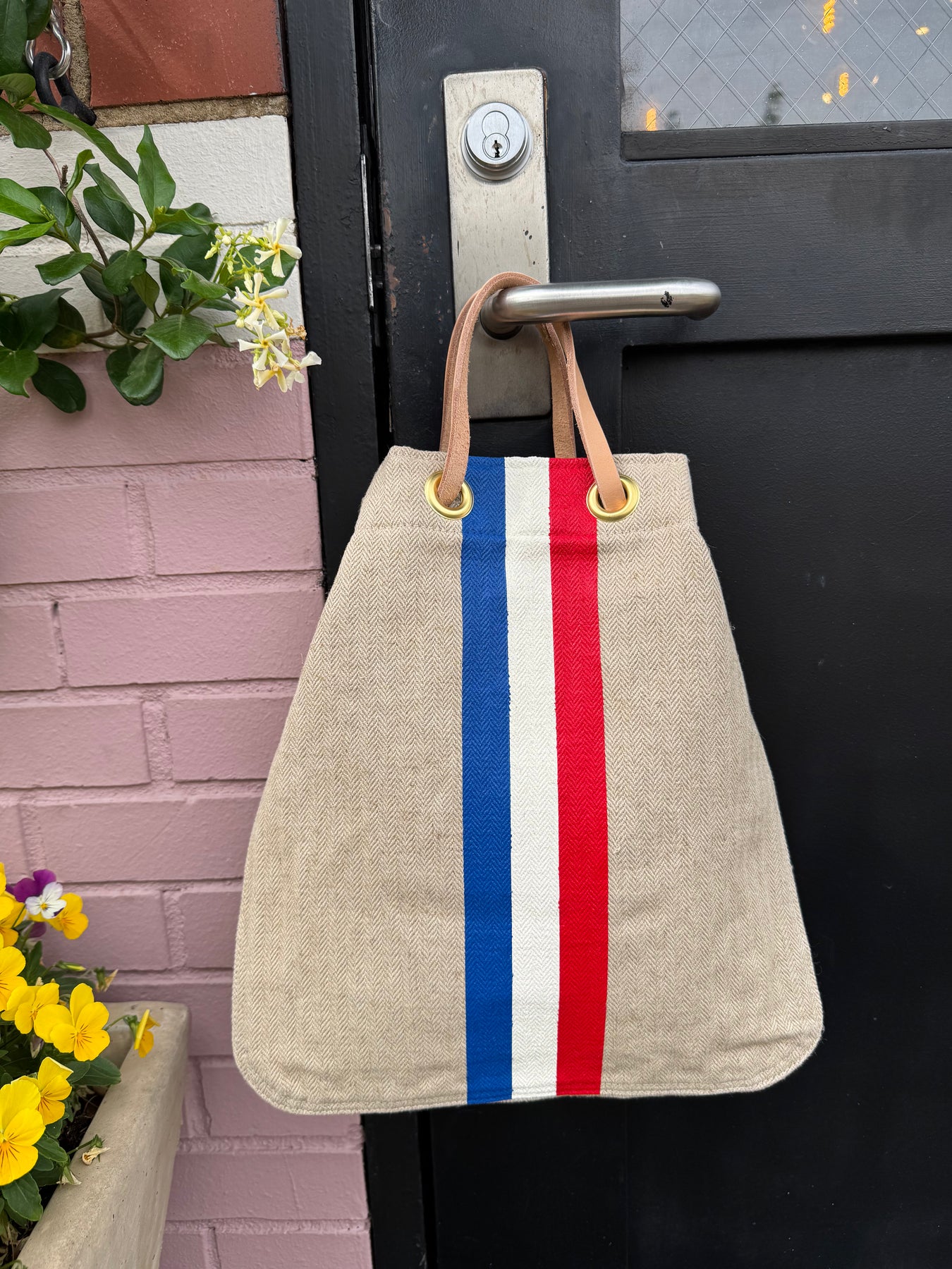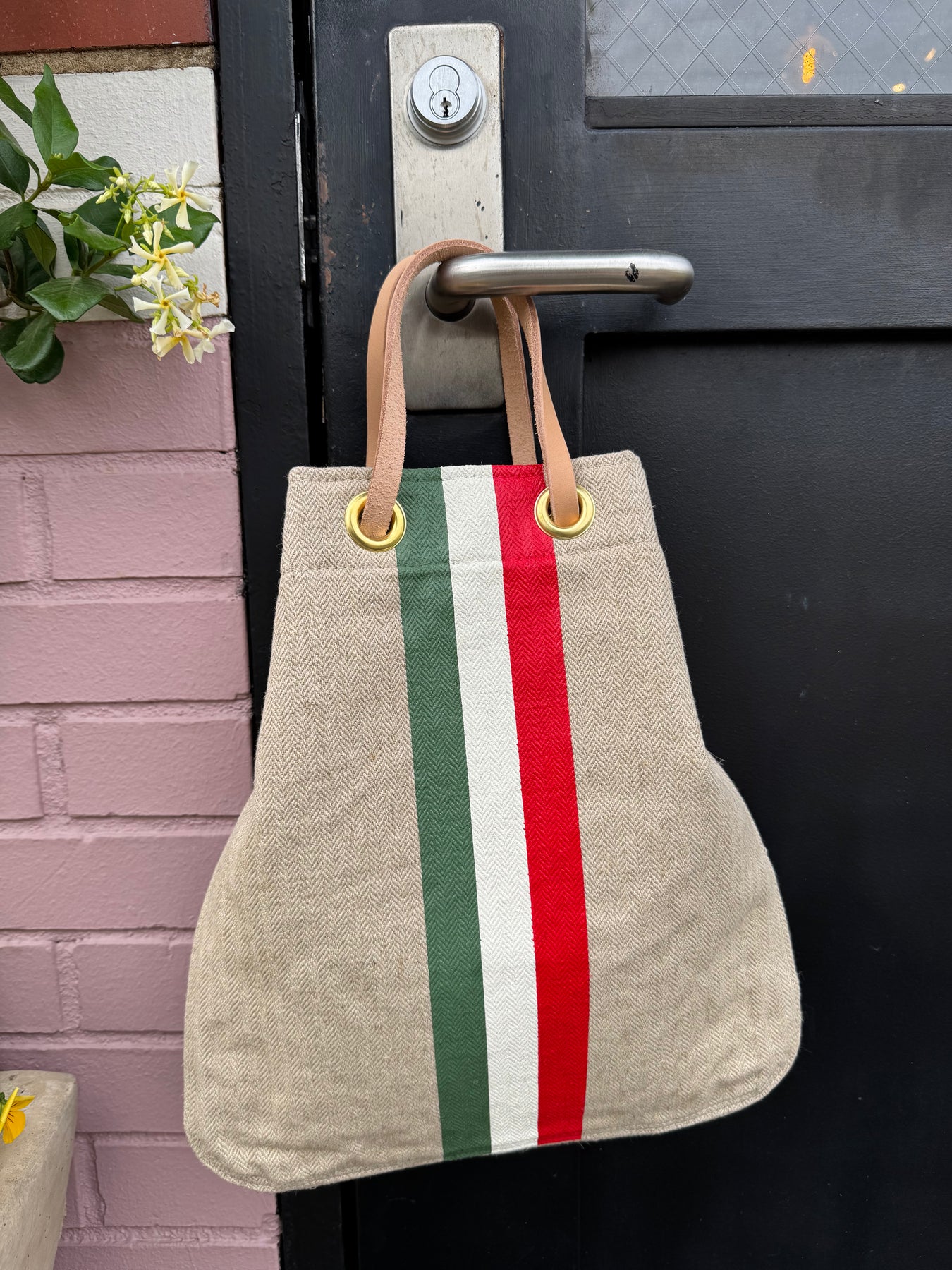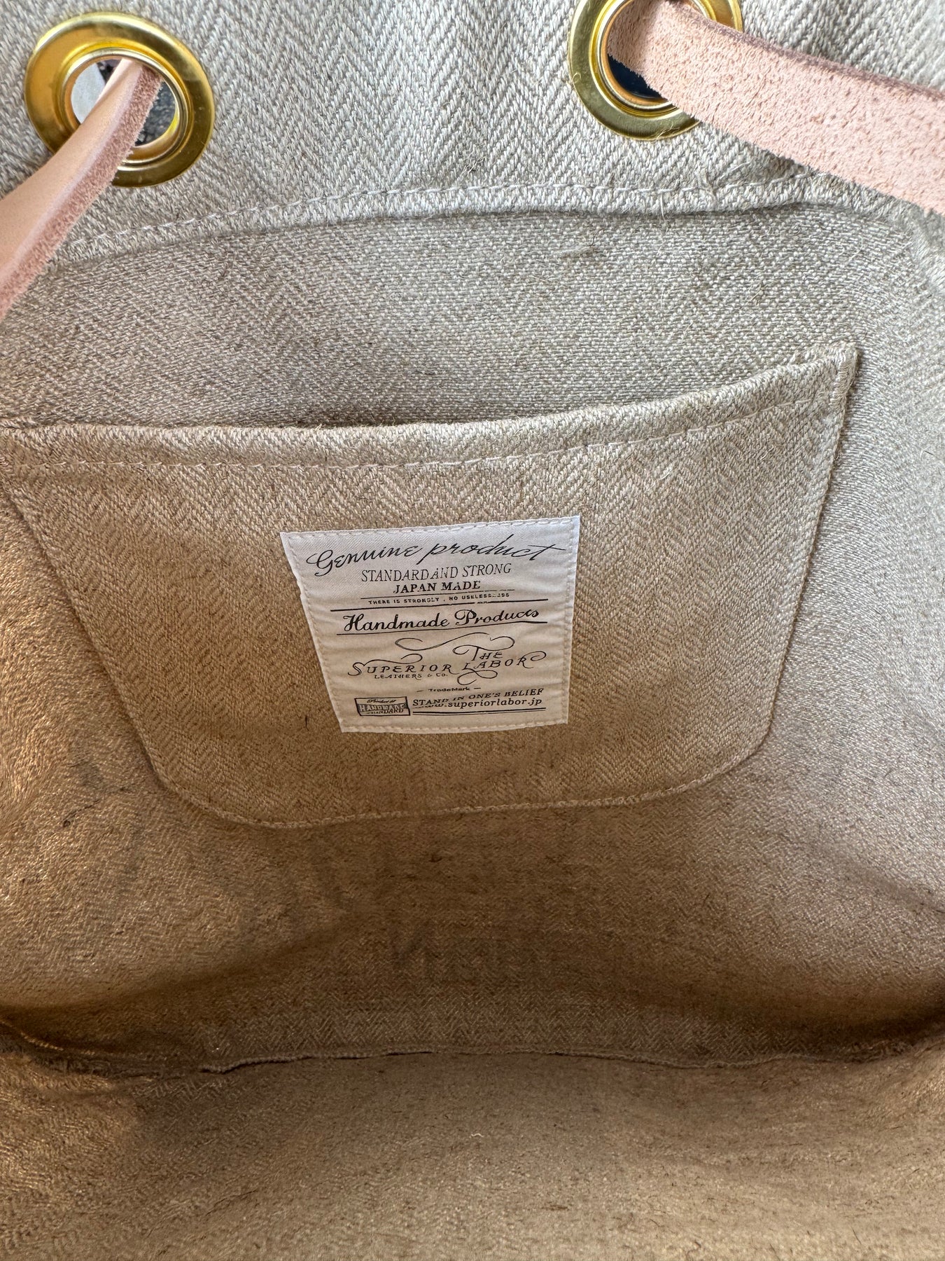 The herringbone woven fabric has an antique feel to it, and is painted in three colors and has the logo stenciled on it.