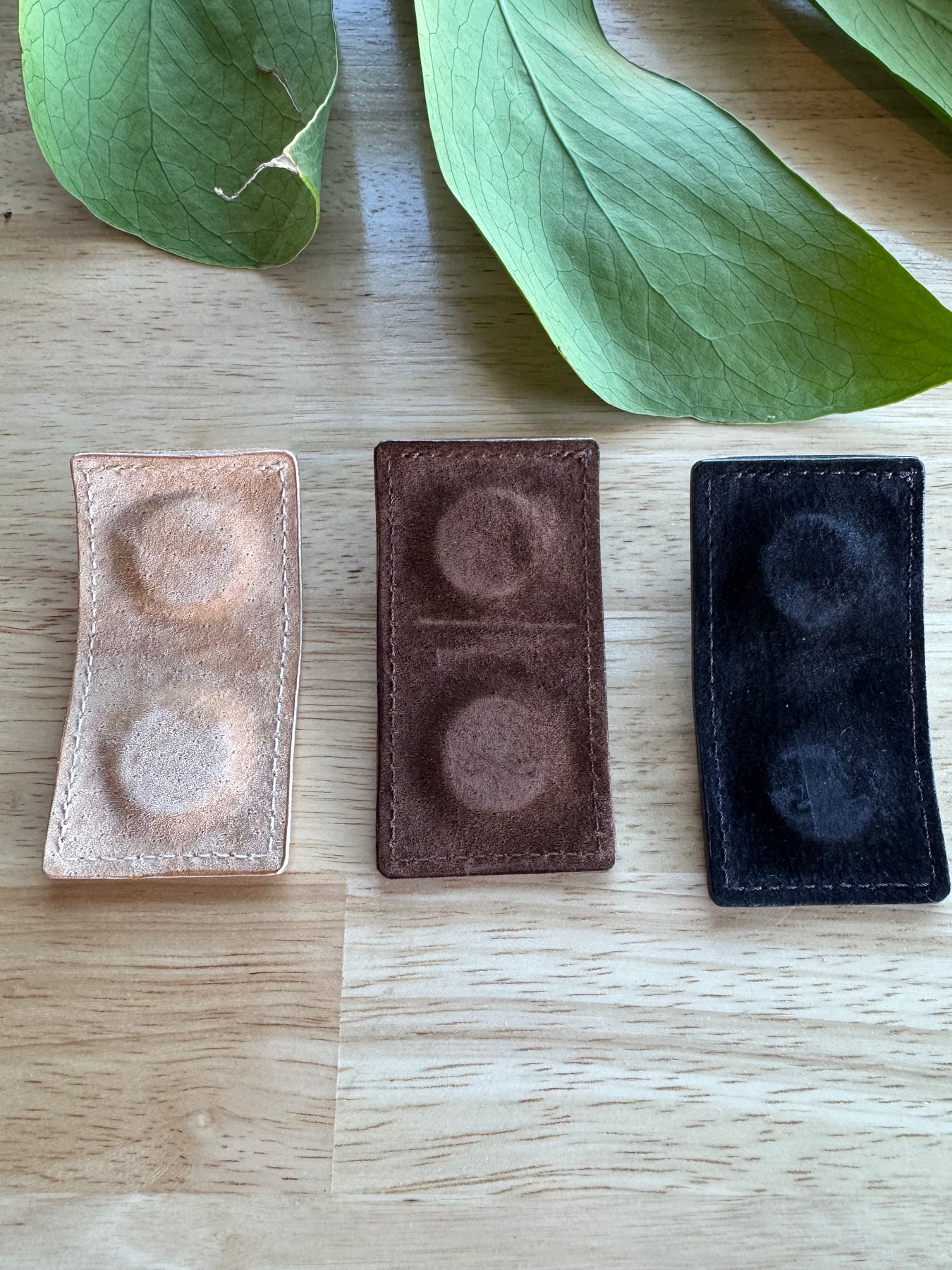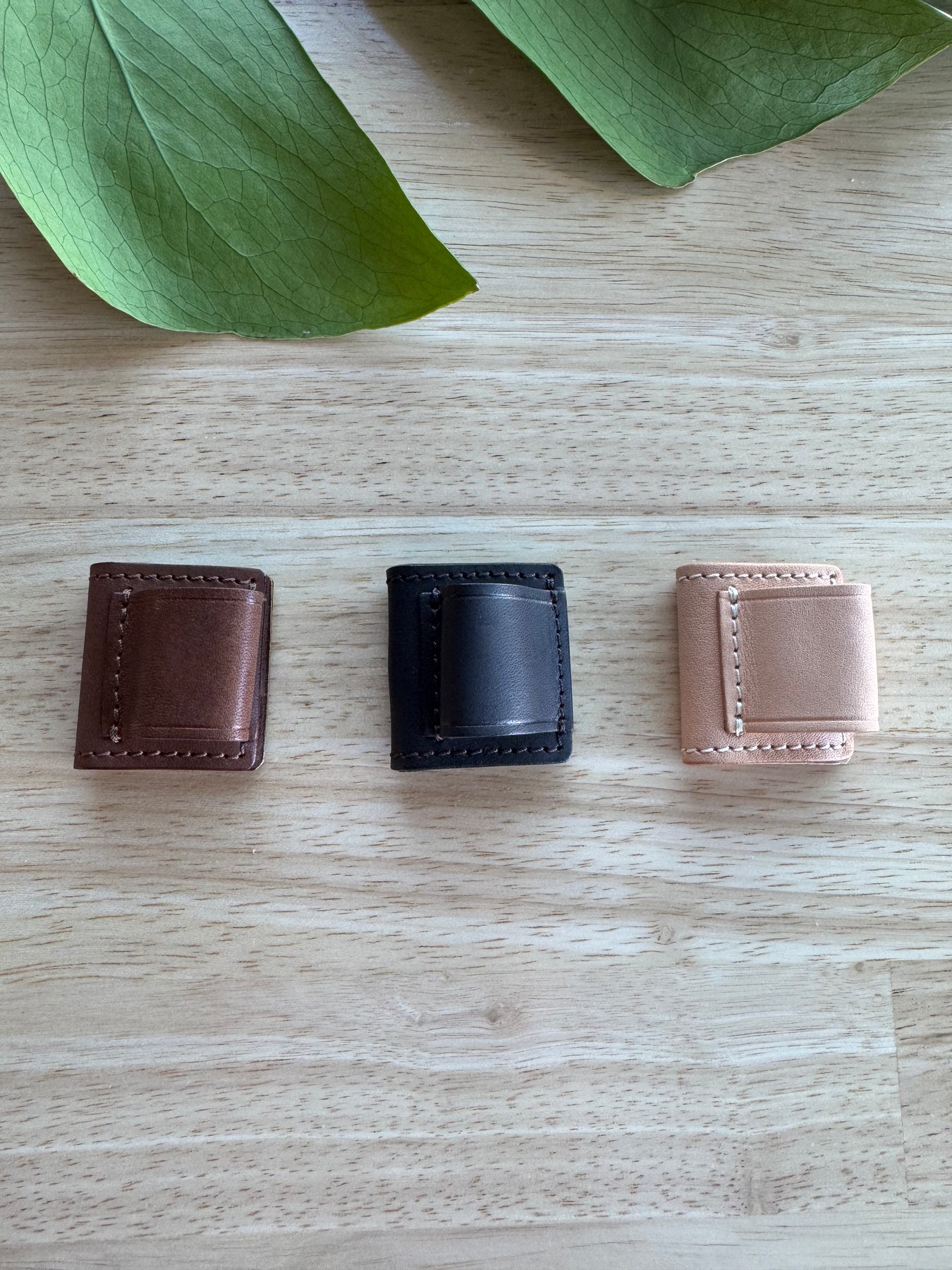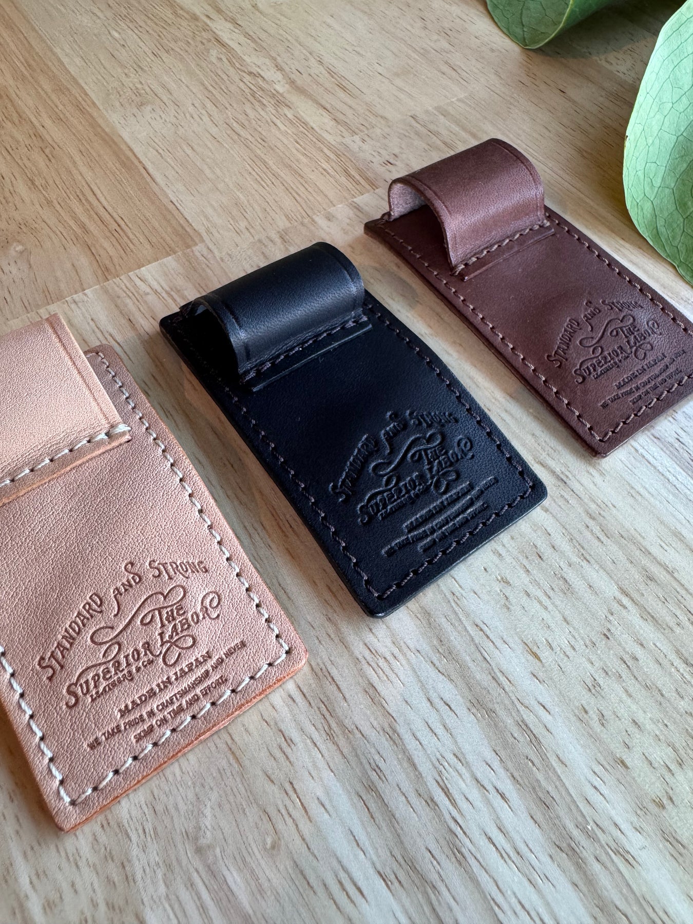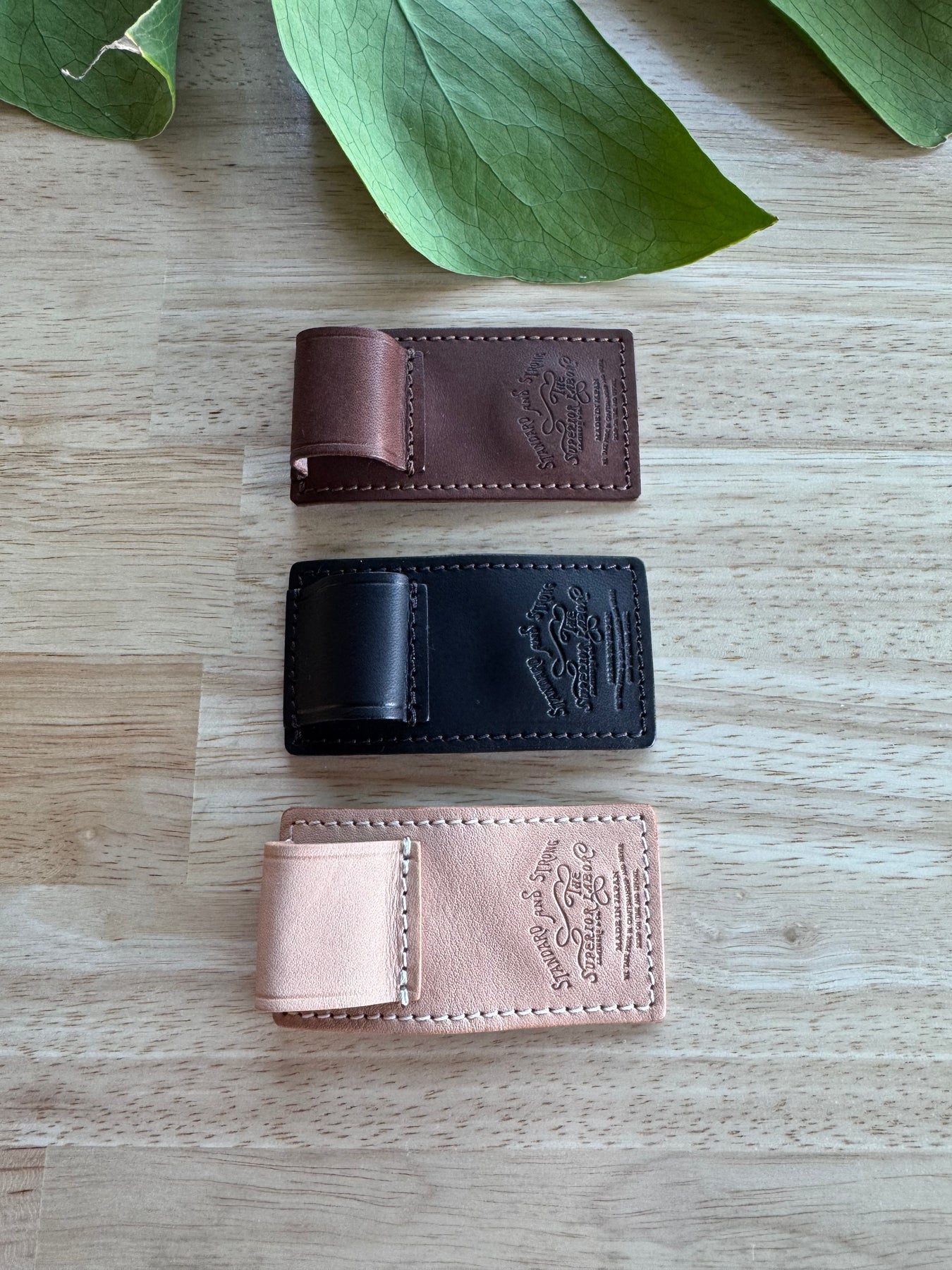 A handy leather pen holder with built-in magnets that clips onto your notebook or planner—so you can carry your pen right along with it.