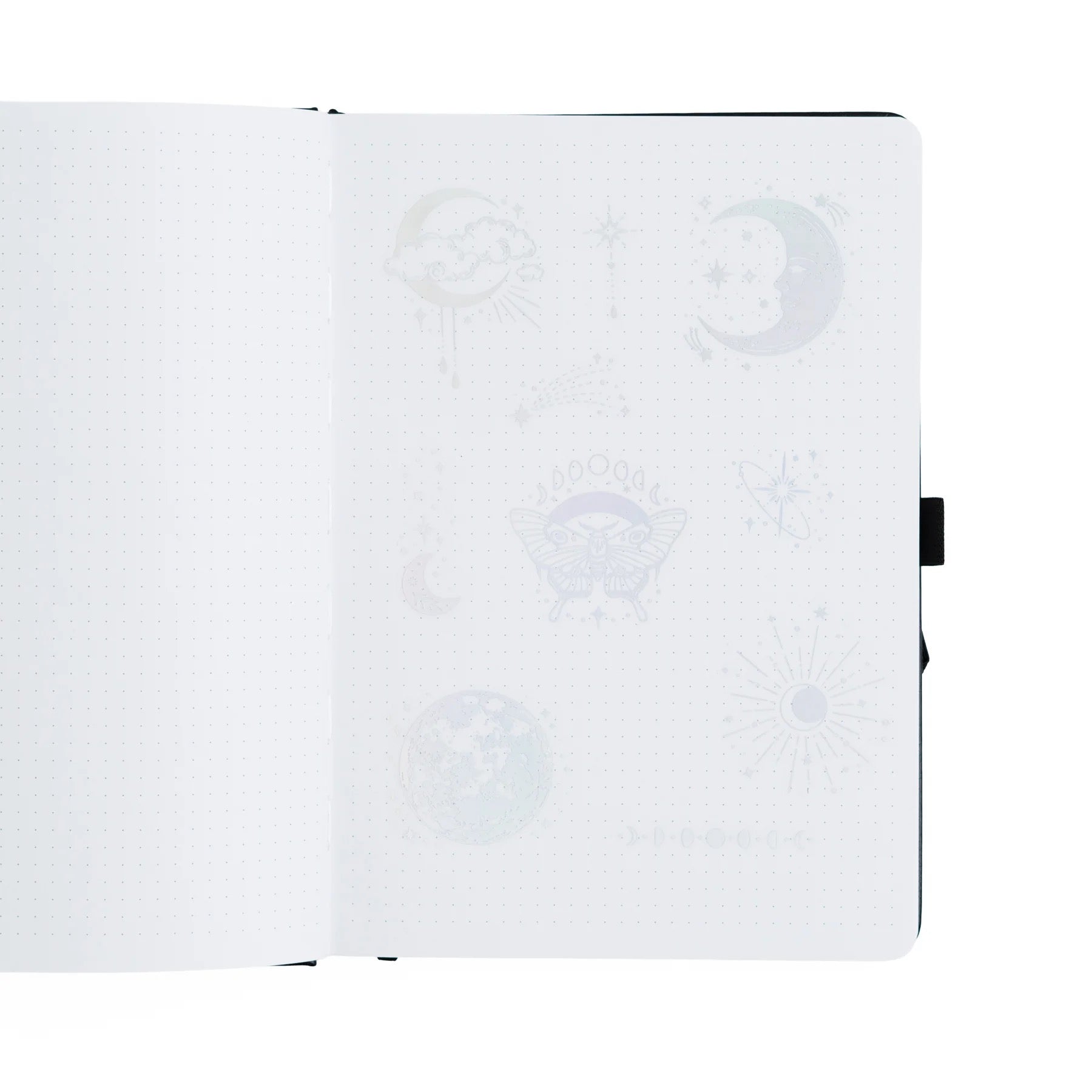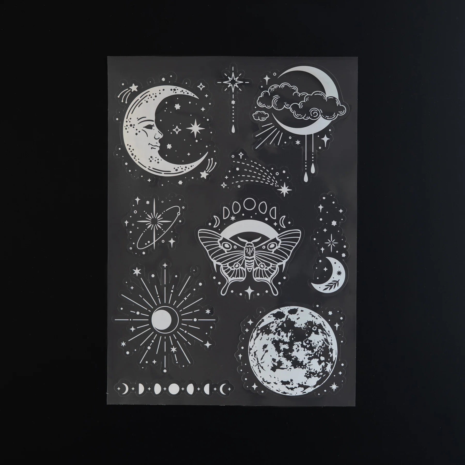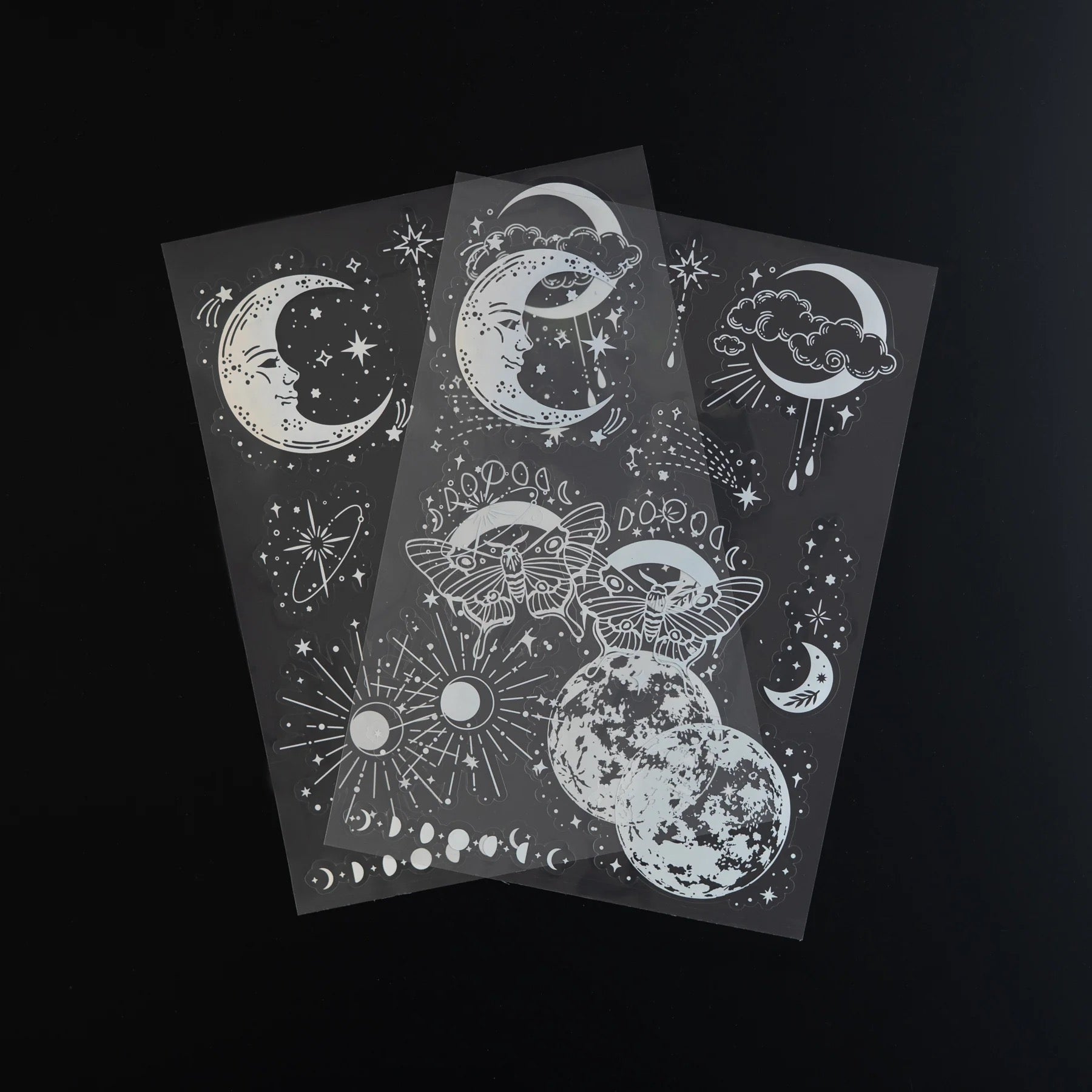 The Lunar Veil Sticker Set includes 2 sheets of celestial-inspired designs to match the Lunar Veil collection. Perfect for adding cosmic details to journals, planners, and creative projects. Printed on clear PET with matte finish.