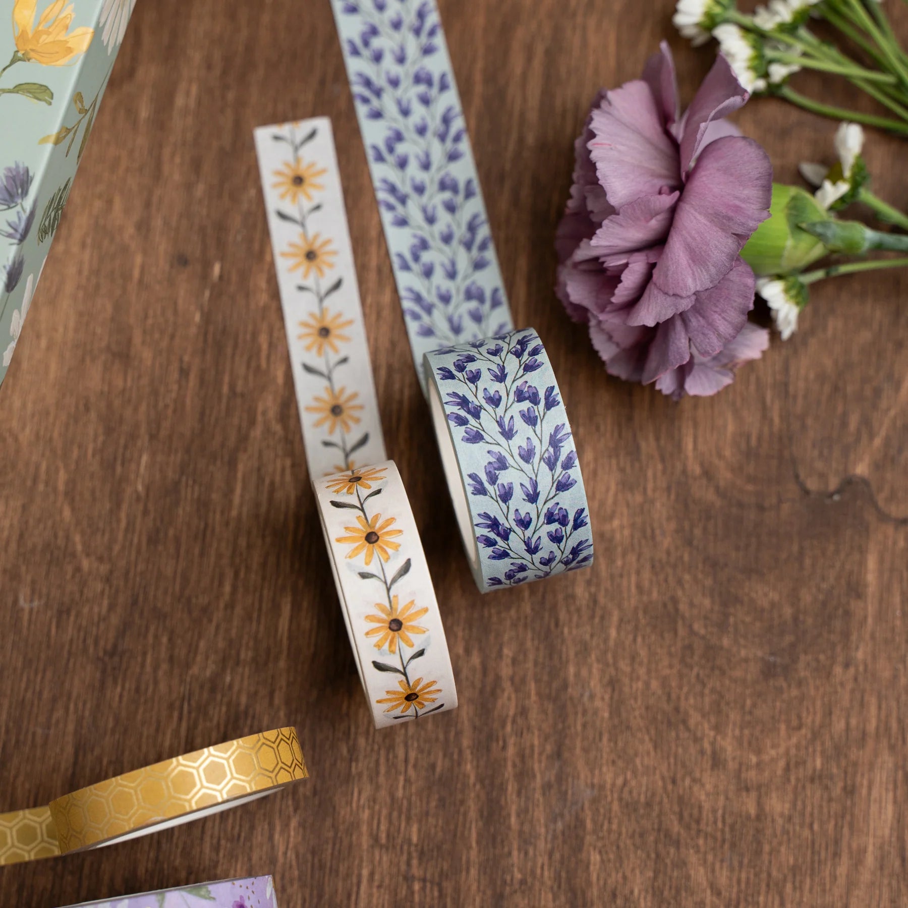 Enjoy this set of four decorative tapes inspired by summer gardens full of beaitiful flowers, bees buzzing about, and sweet honeycomb patterns.