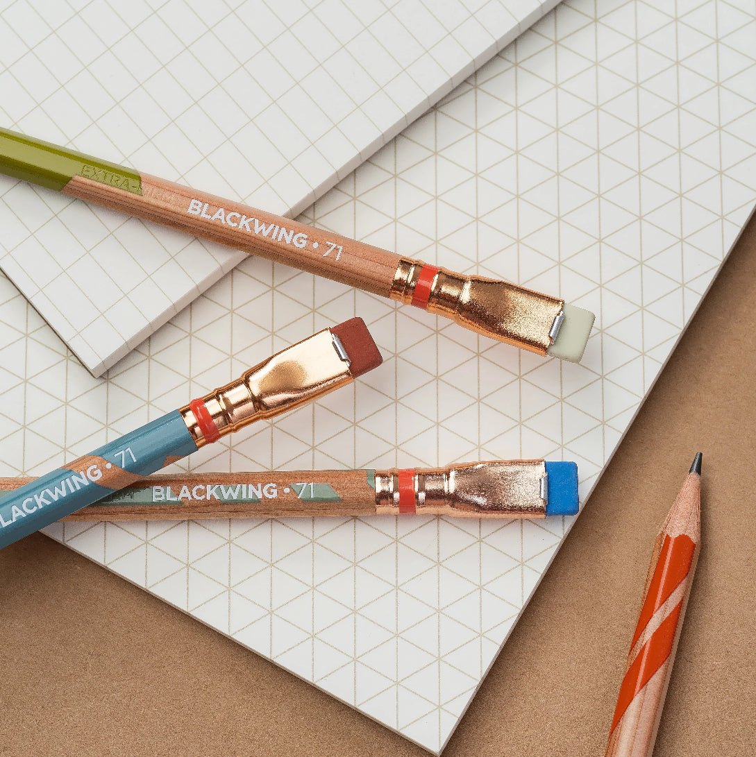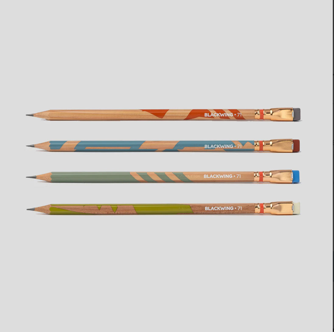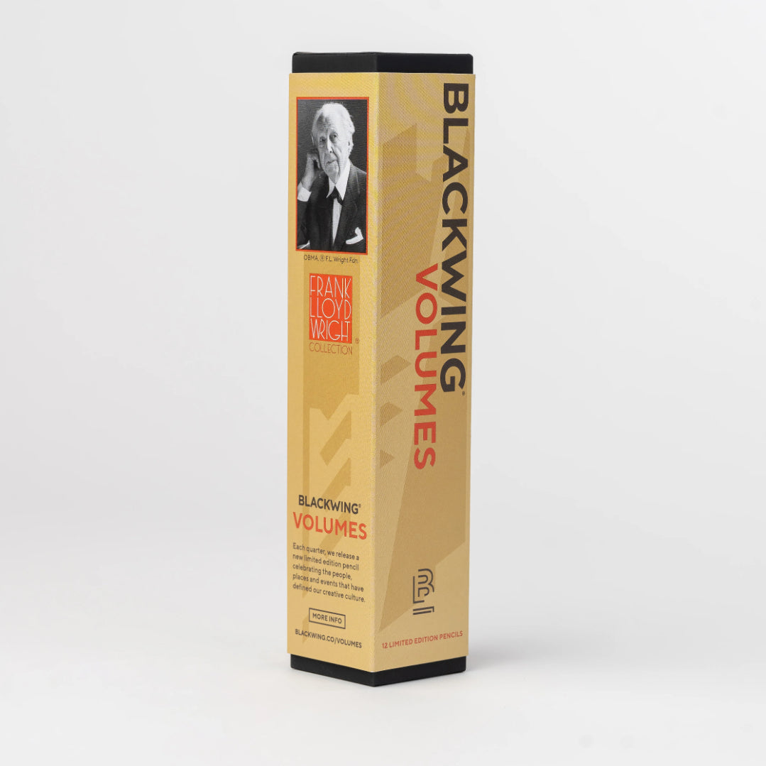 Tribute to Frank Lloyd Wright and his architectural ambition. Each pencil features silhouette of one of Wright’s iconic perforated boards printed in a muted, midcentury palette. The area around the board is unfilled, letting the natural wood of the pencil shine through. Each pencil also includes a copper ferrule and our extra-firm graphite.