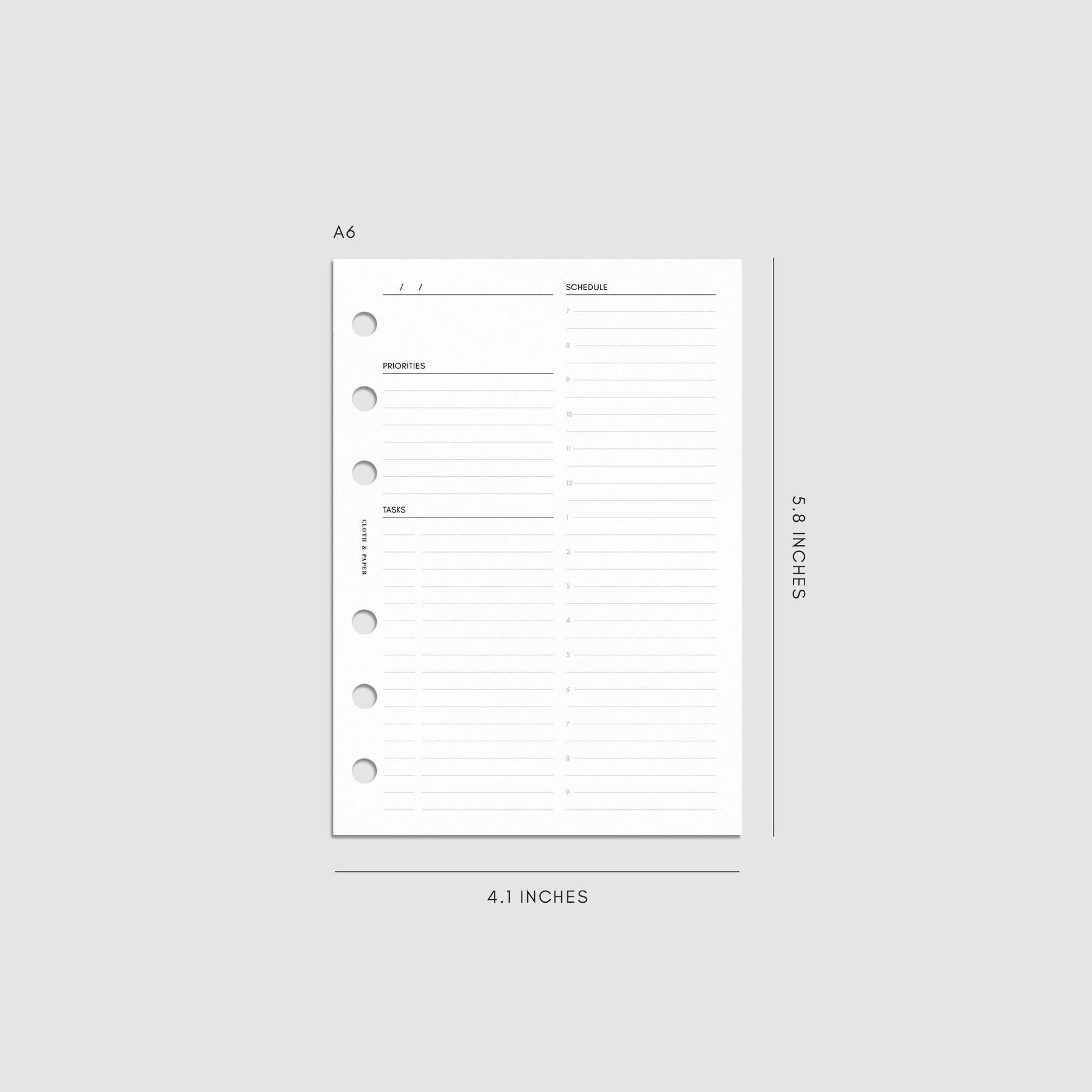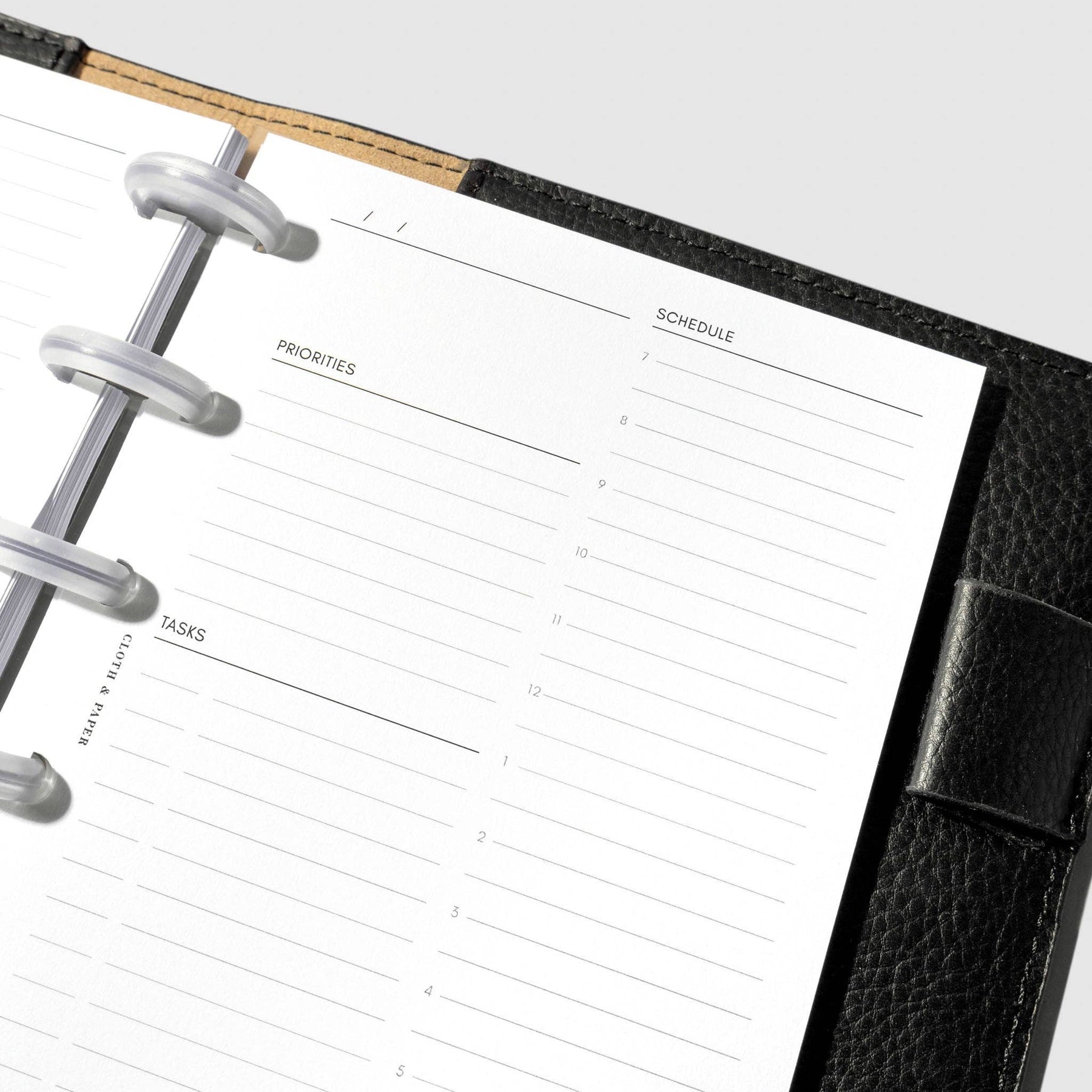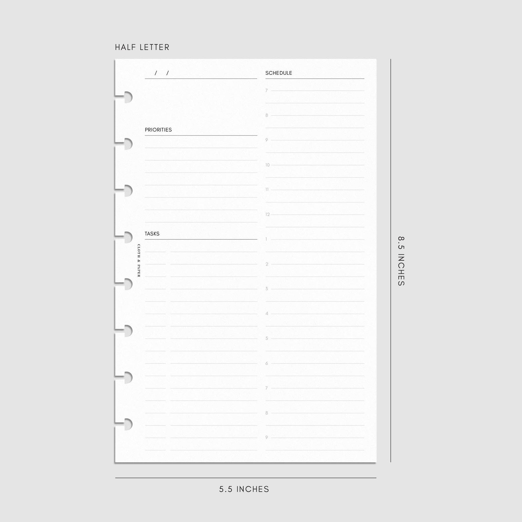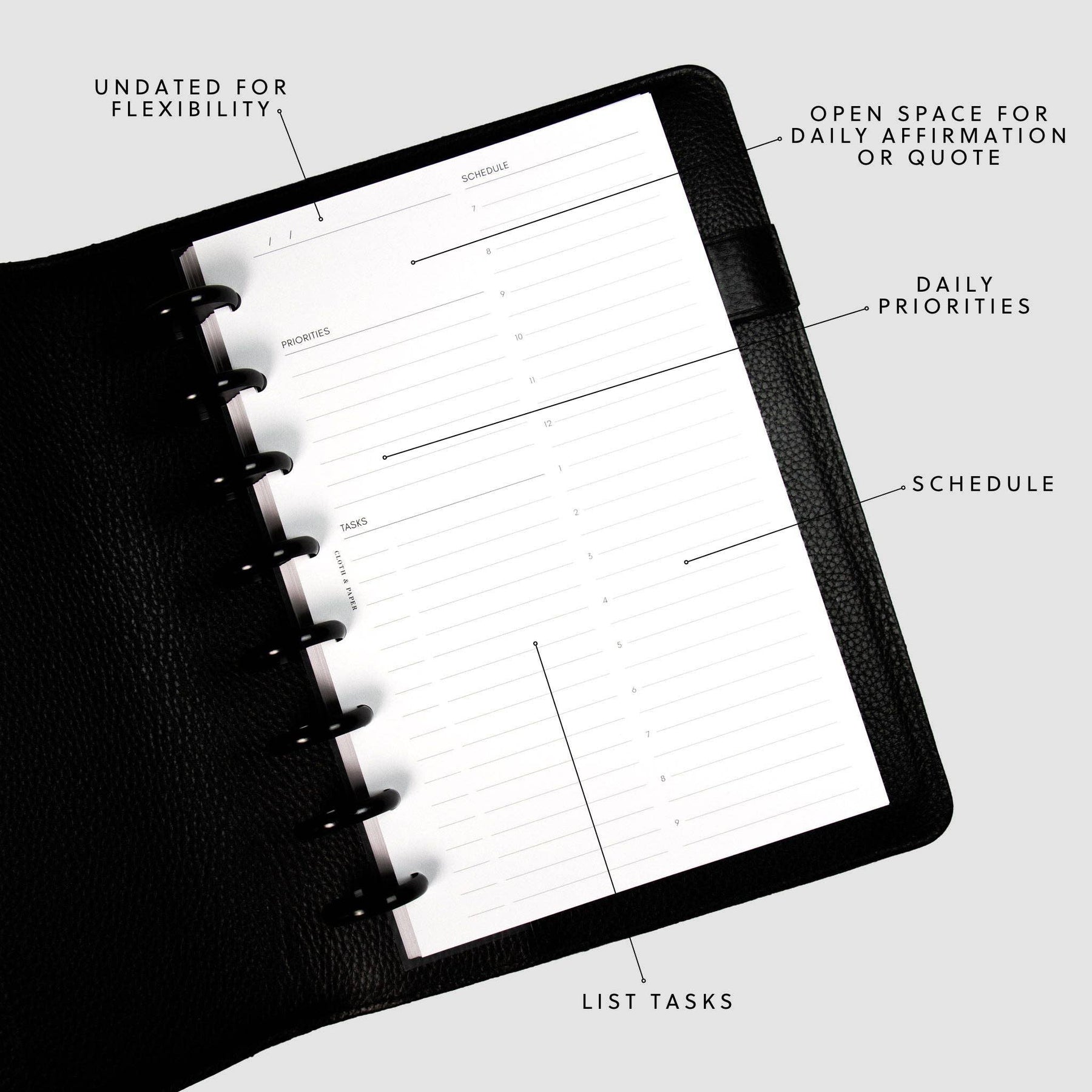 Listing is for Undated Daily Planner Inserts | Refreshed Layout only; other pictured items not included. Pictured size is Half Letter 8-Disc Punch.