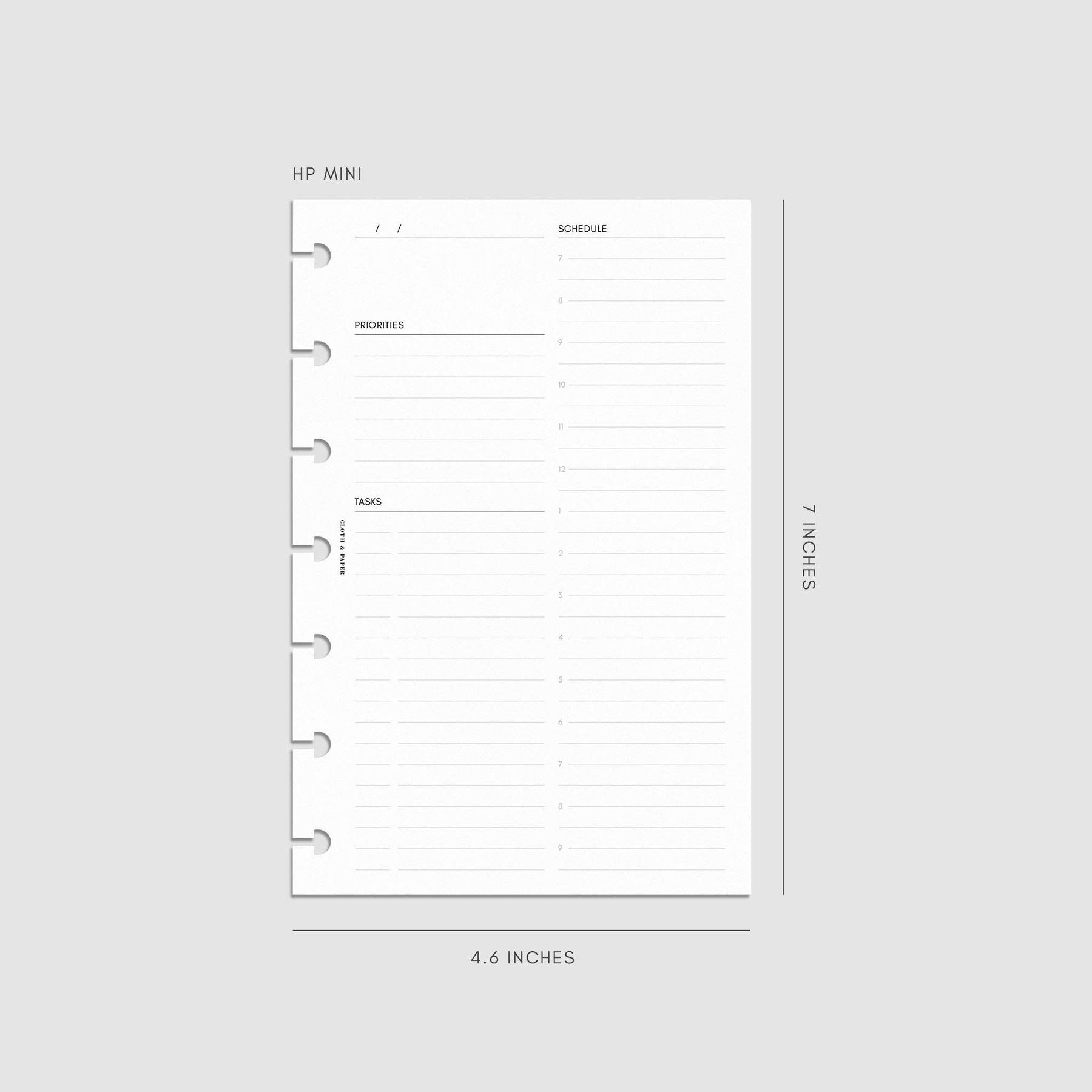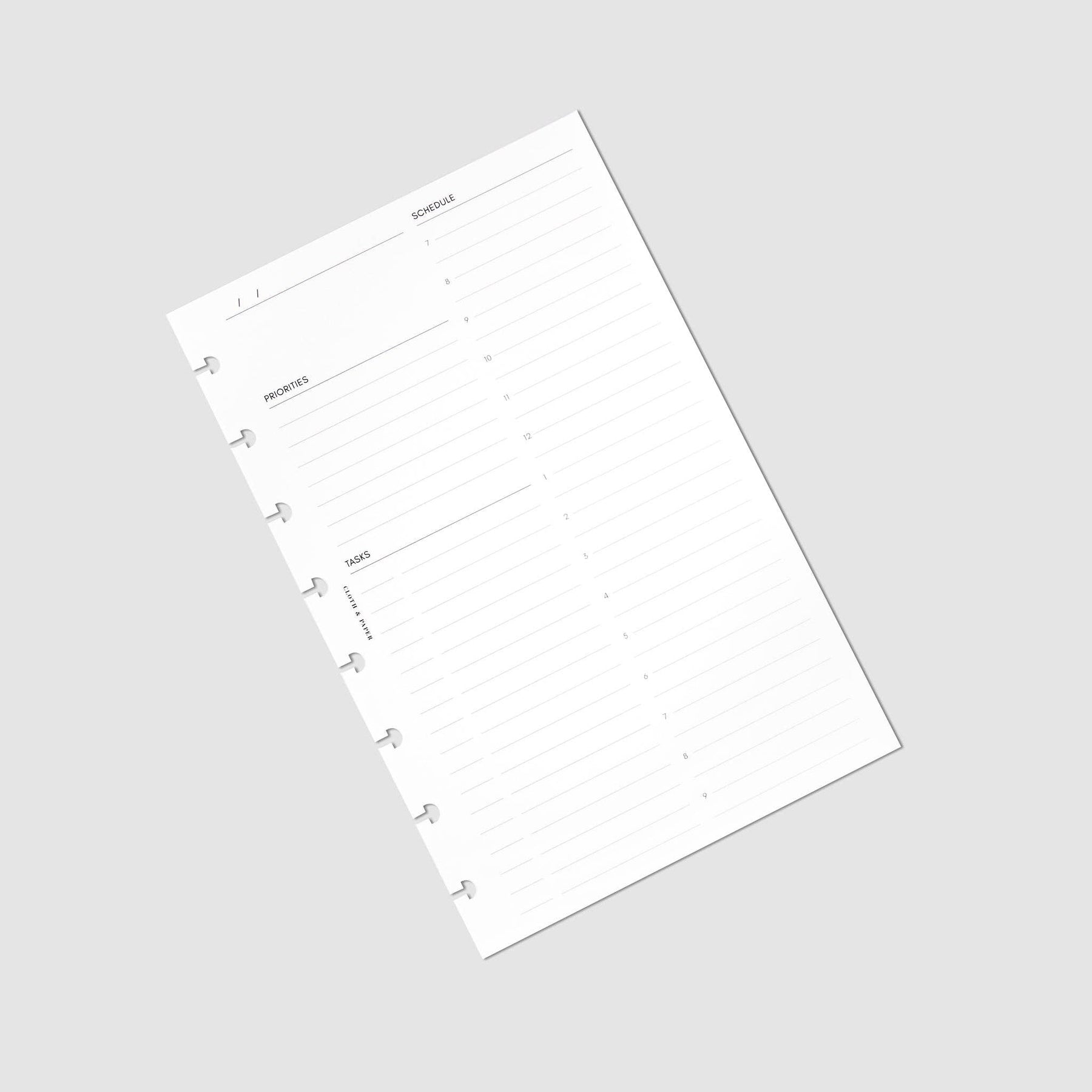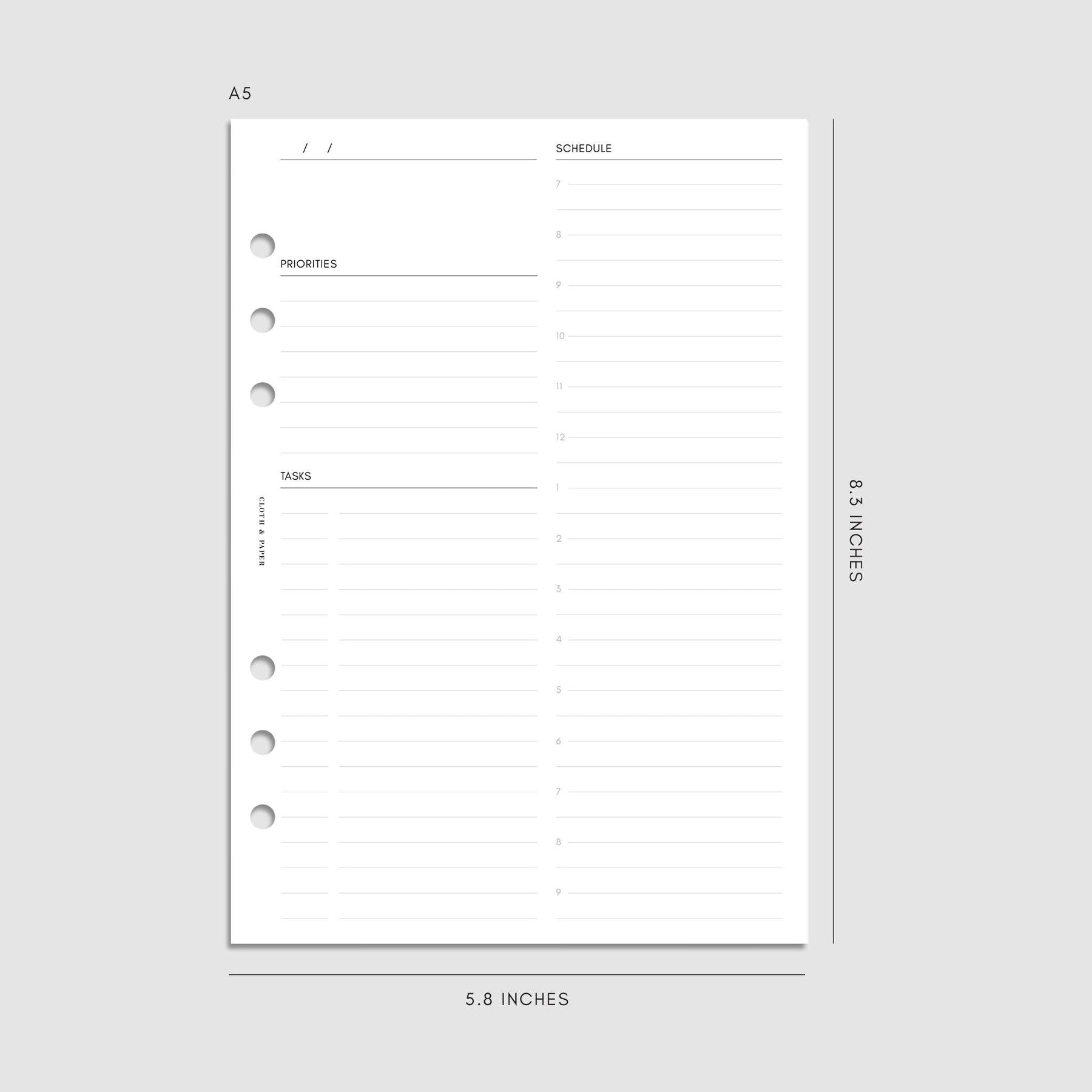 Listing is for Undated Daily Planner Inserts | Refreshed Layout only; other pictured items not included. Pictured size is Half Letter 8-Disc Punch.