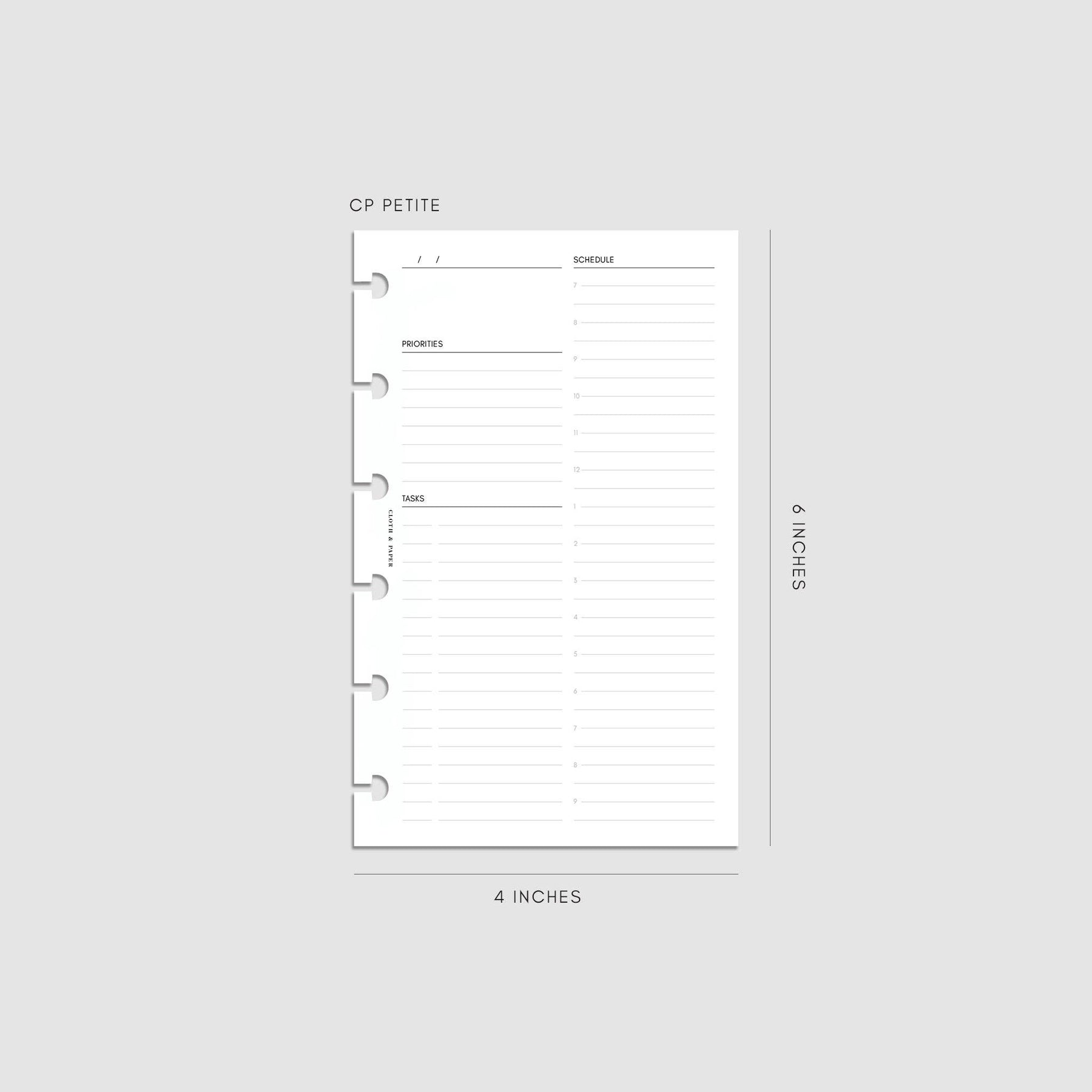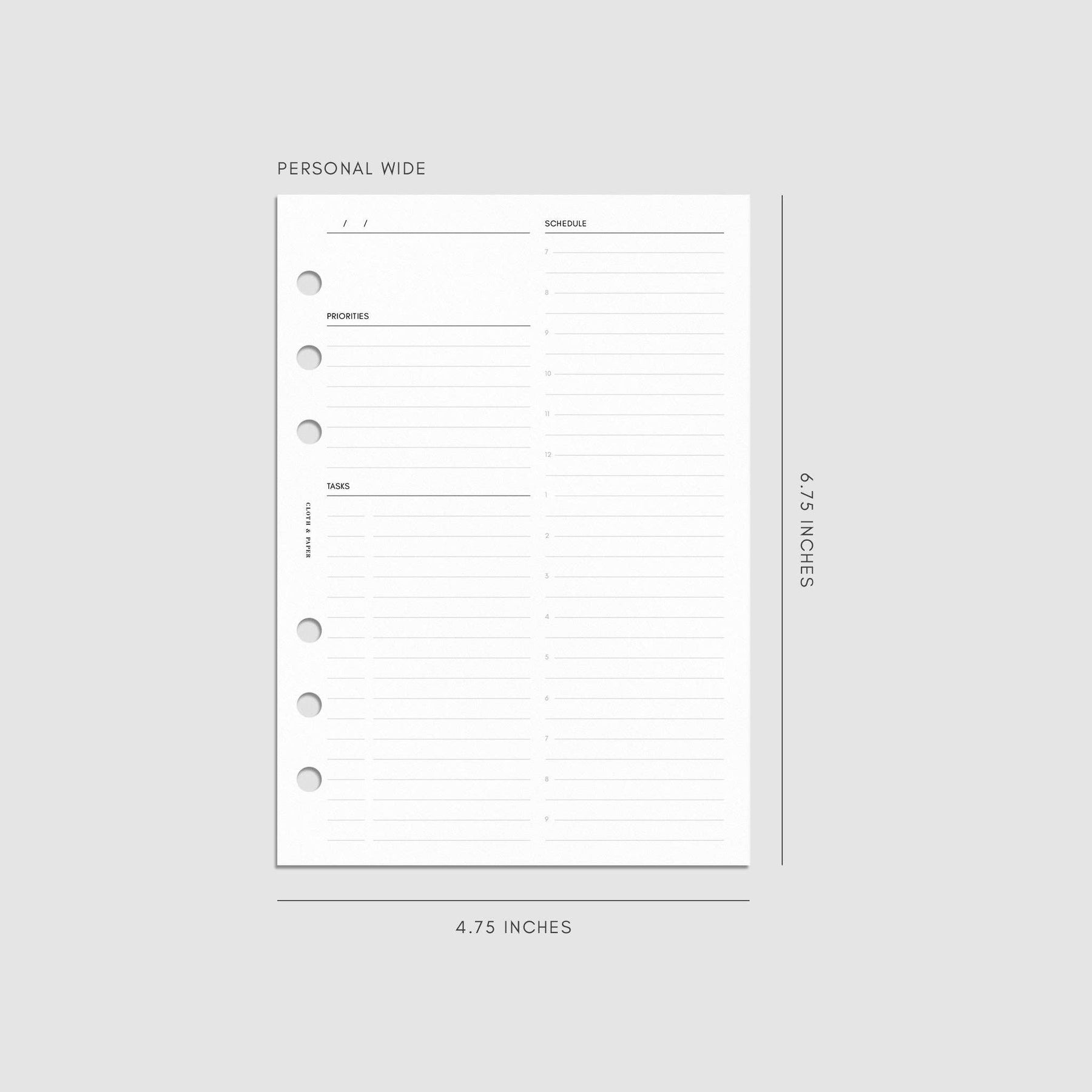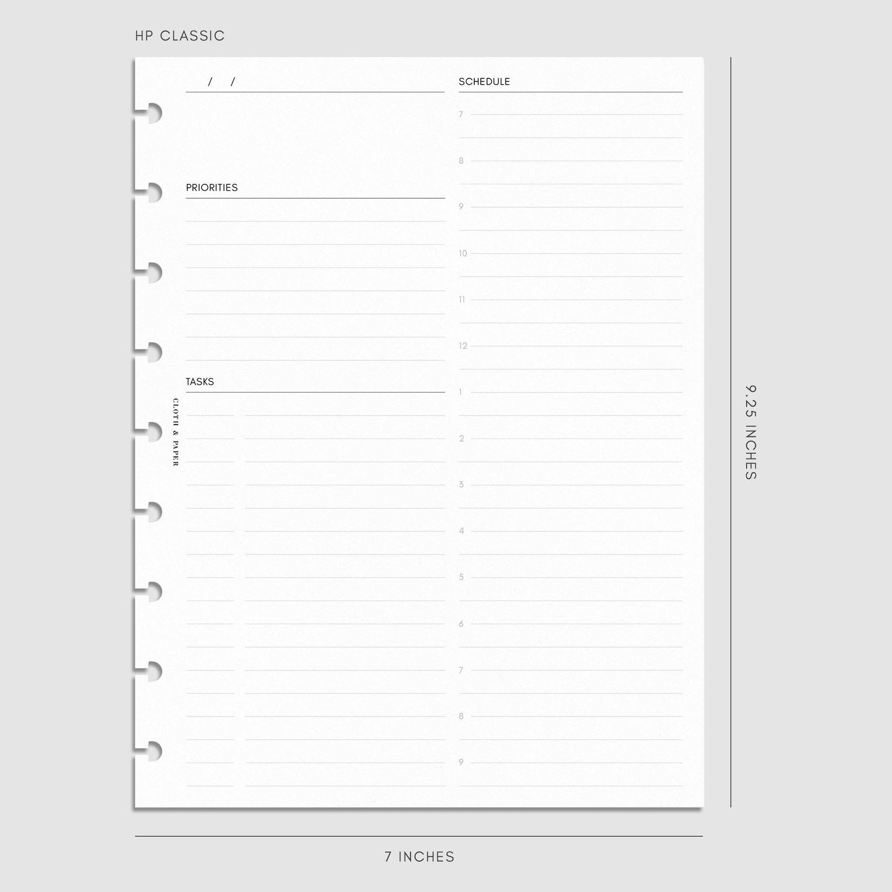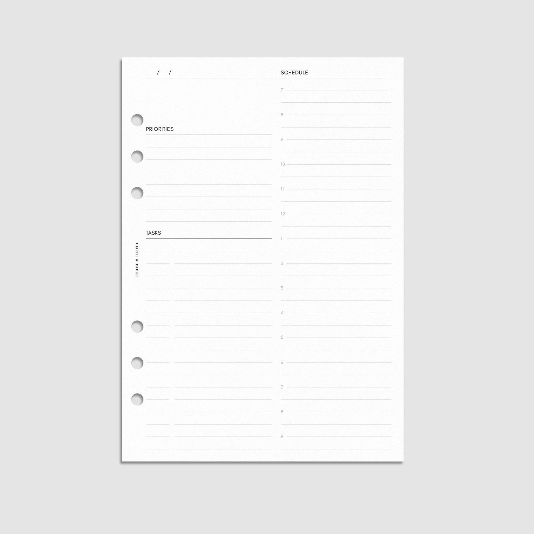 Listing is for Undated Daily Planner Inserts | Refreshed Layout only; other pictured items not included. Pictured size is Half Letter 8-Disc Punch.