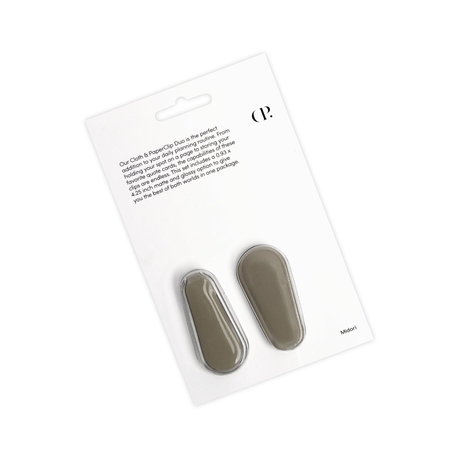 Add a pop of color to your planner setup with our very own Cloth & PaperClip, a magnetic clip perfect for marking your place, adding a quote card, or keeping track of charging cables! Midori, a new color to C&P, is inspired by the Japanese word for green. Its subtle green hue represents the earth and natural environment around us, giving you the inspiration to step back and take in the world around you. This set comes with two Midori clips - one matte and one glossy - for whatever mood you're feeling.