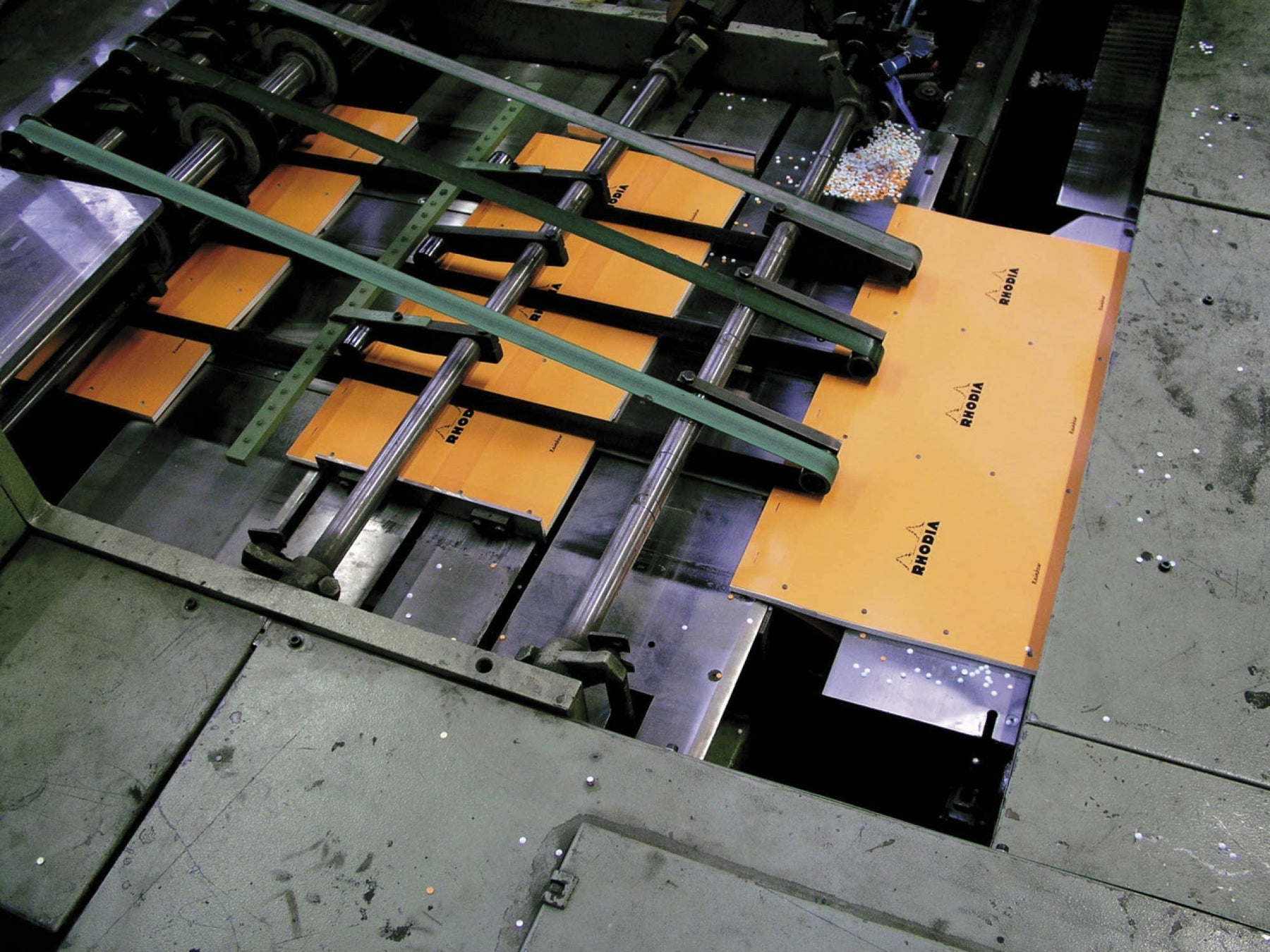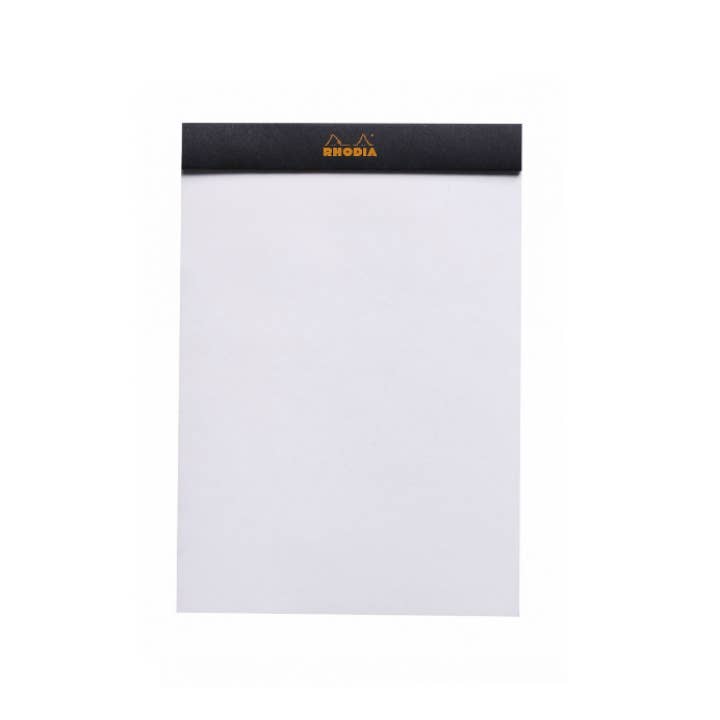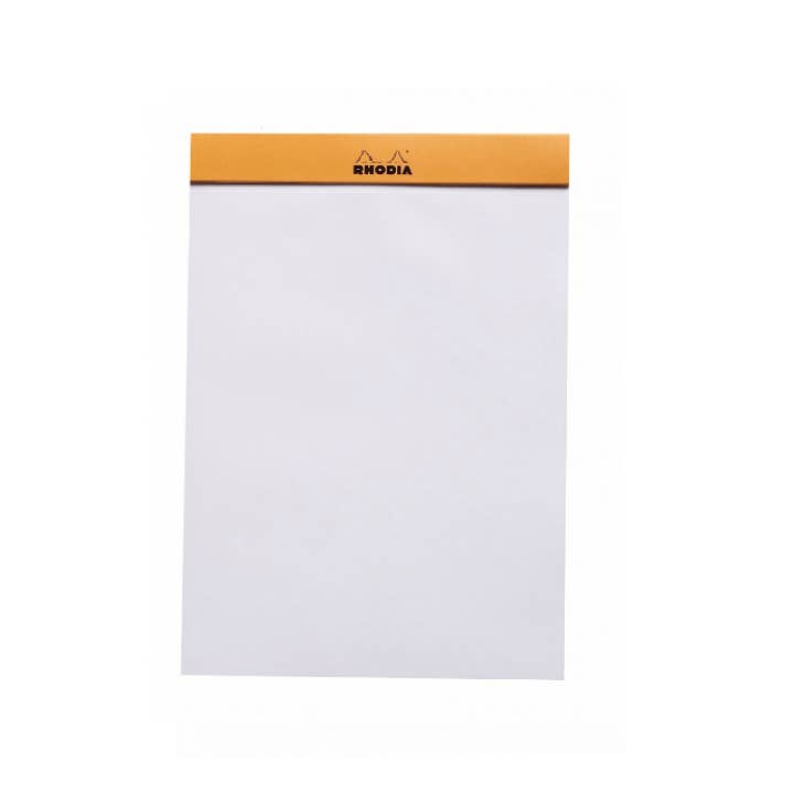 Our classic Rhodia pad with iconic cover features 80g exceptionally smooth, French-milled paper. Fountain pen and marker friendly. 80 sheets, micro-perforated for easy and clean removal. Staple bound at top. Cover is scored to neatly fold back. Rigid back makes sketching or writing easy and portable. 8.25 x 11.75 - Orange or Black - Choose from Blank, Graph, Dots, Lined with Margin or Lined with 3 Loose-leaf Holes. Made in France.