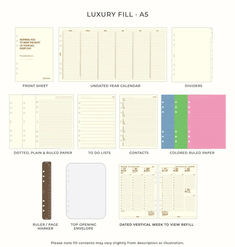 Paper Flyleaf, Front Sheet, Undated Year Planner, 6 Dividers Blank, Dotted paper, Plain paper, Ruled paper, To Do lists, Contacts, Blue ruled paper, Green ruled paper, Pink ruled paper, Ruler / page marker, Top opening envelope.