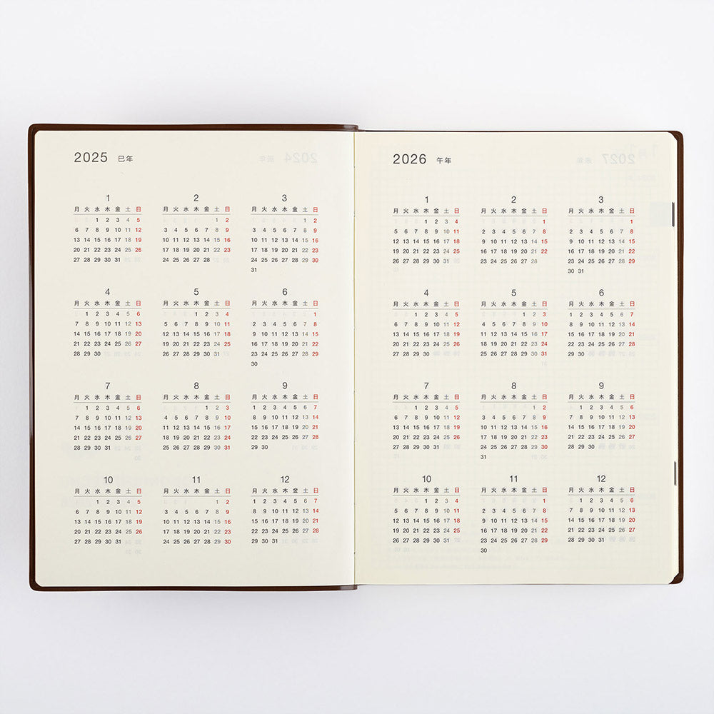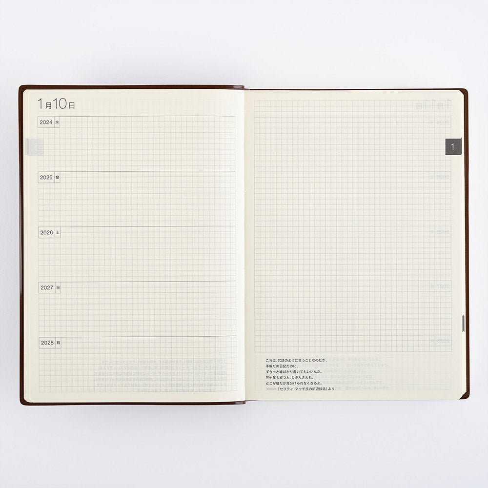 Each left-hand page shows the same date across 5 years, and the right-hand page has free space you can fill in. Each daily entry comes with 352 squares so you can write plenty. The book spansJanuary 1, 2026 to the end of 2030 for a total of five years. The calendars are Monday-start. The book is bound like a dictionary or bible so you can use it without a cover.