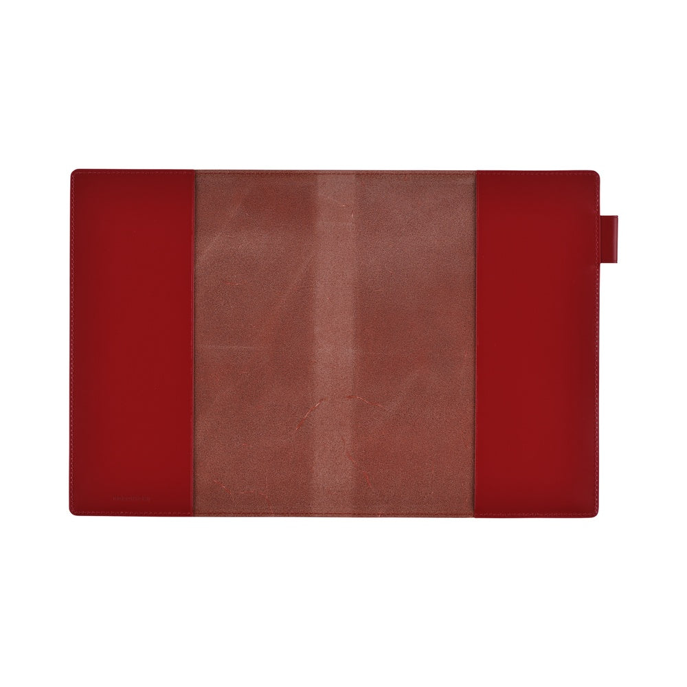 This cover fits a Large Hobonichi 5-Year Techo book. Holds a pen inside by its clip. Uses natural leather and changes color over time as it ages.