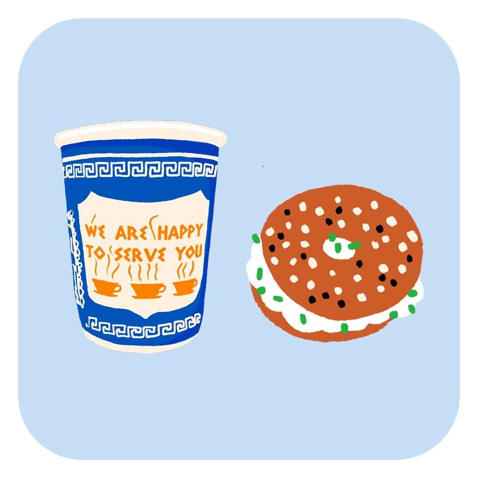 The iconic Greek Coffee Cup and a New York scallion cream cheese bagel. Chef's kiss.