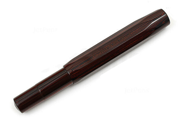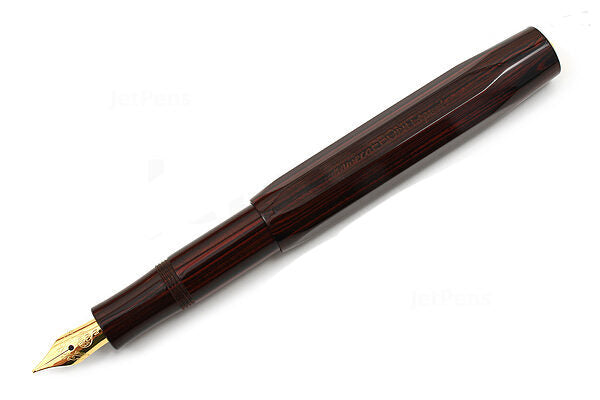 This fountain pen combines traditional ebonite construction with the classic hexagonal Kaweco Sport body. True to the slogan "small in the pocket, great in the hand," the Sport fountain pen is a compact 4.2 inches when closed and a comfortable 5.2 inches with the cap posted. It features a screw-on cap for extra security, a gold-colored steel nib, and a metal Kaweco logo on the top of the cap.