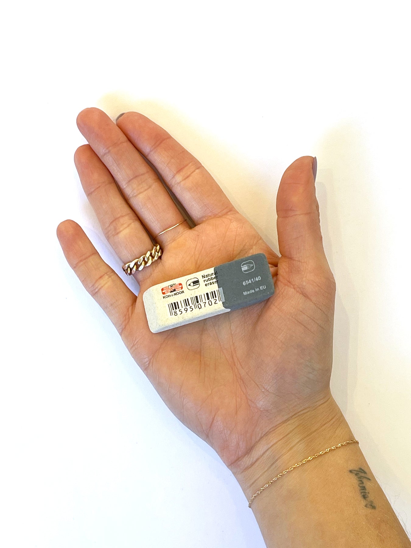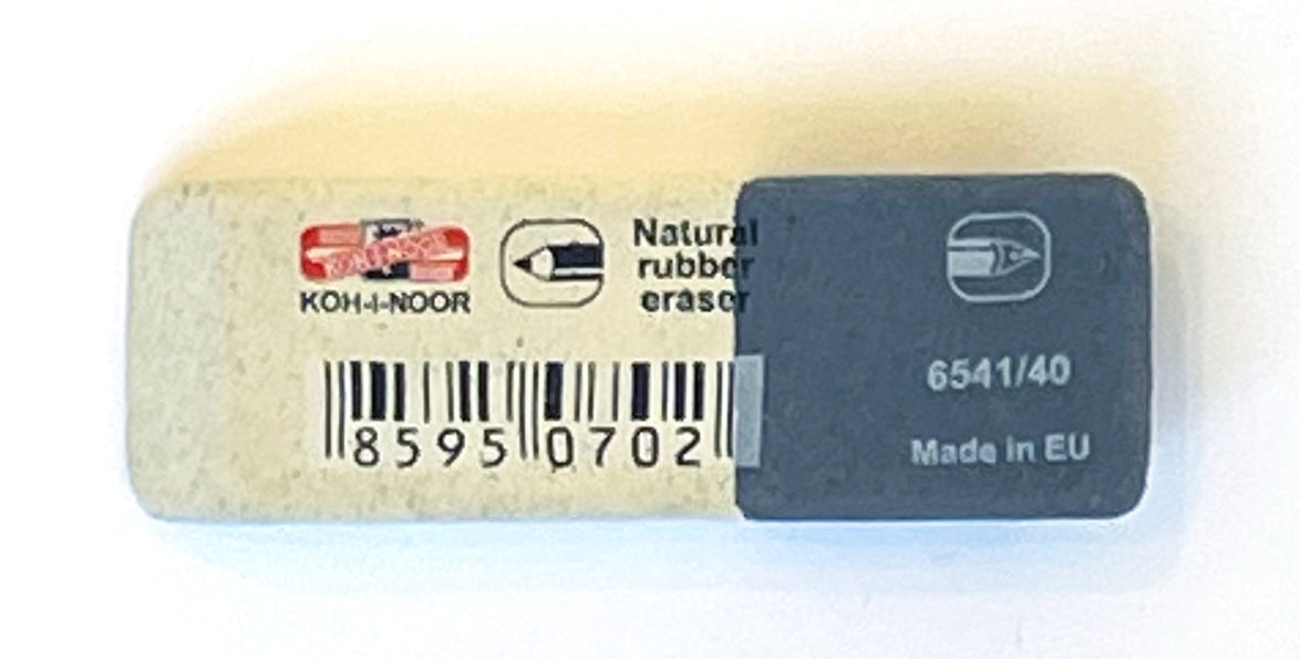 Office natural-based eraser without addition of plastic materials and phthalates. Soft part (white) is designed for erasing of graphite lines of medium classes of hardness. Hard part (grey) is designed for erasing of ink lines and stains, Indian ink, typewriting machine letters, and removing leads.