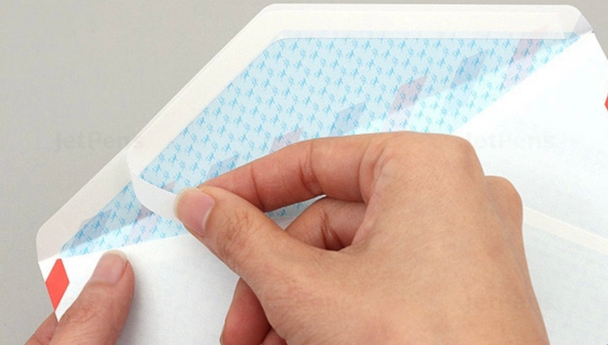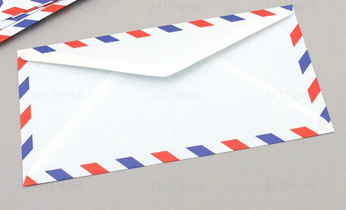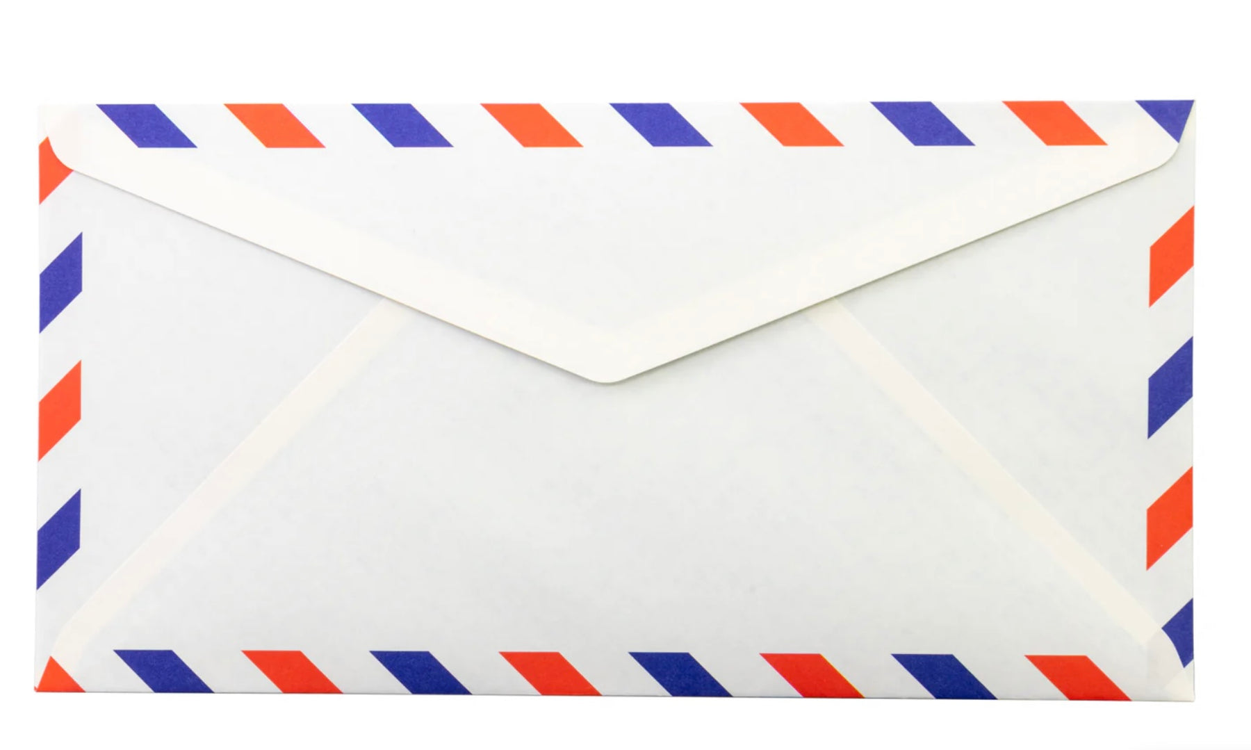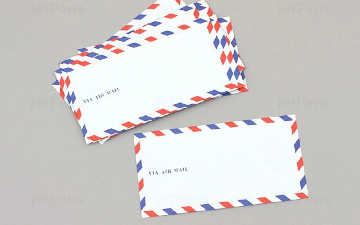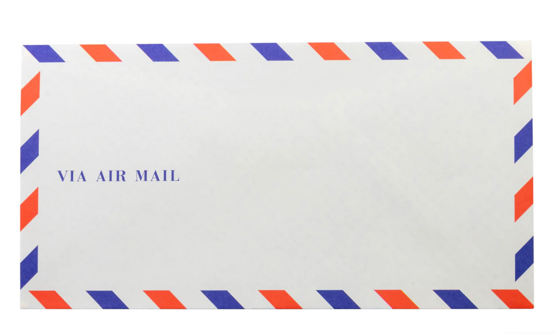 Send your letters in style with these airmail-themed self-adhesive envelopes. To seal, simply peel off the tape and press down. These envelopes are "Western" style, meaning that they open along the long dimension.
