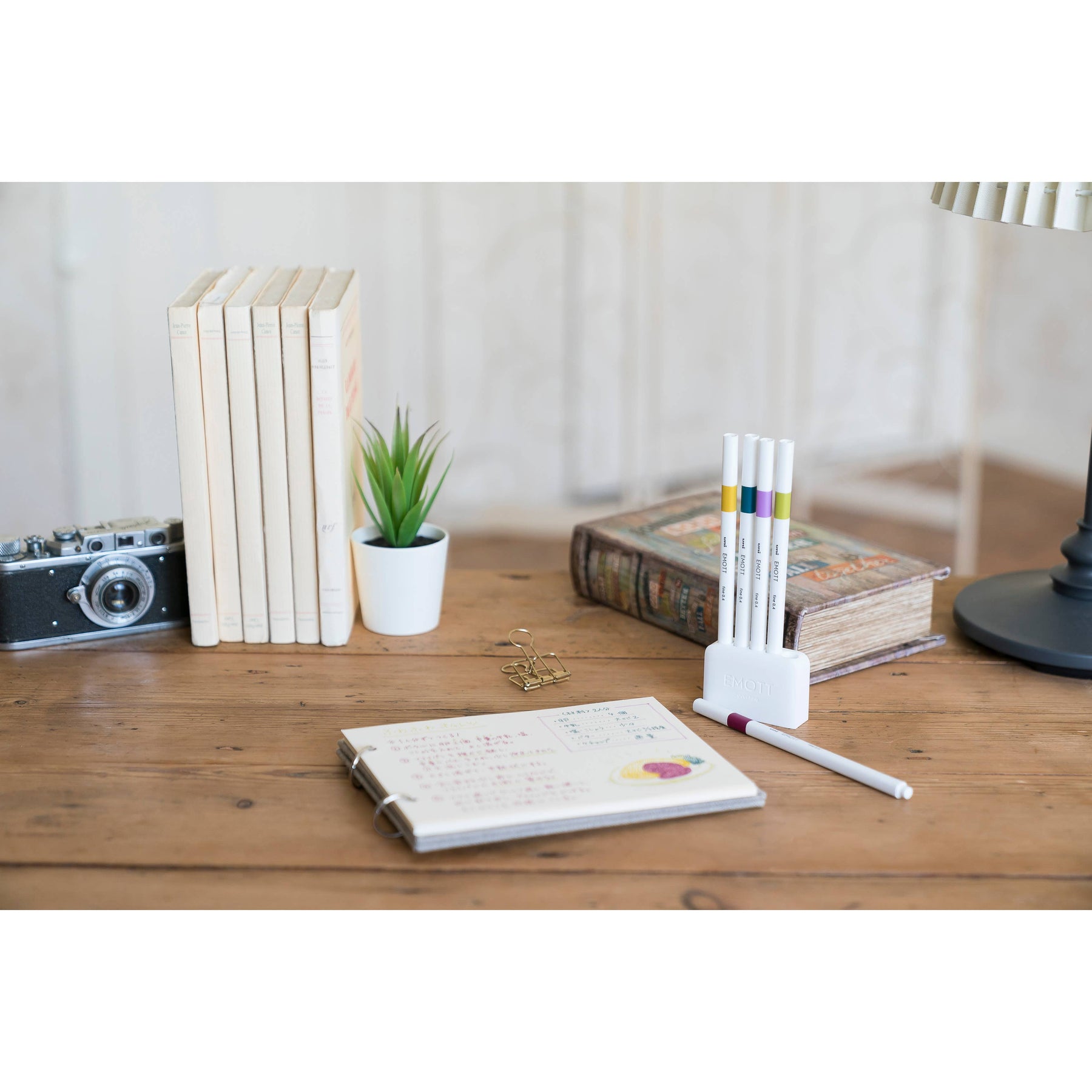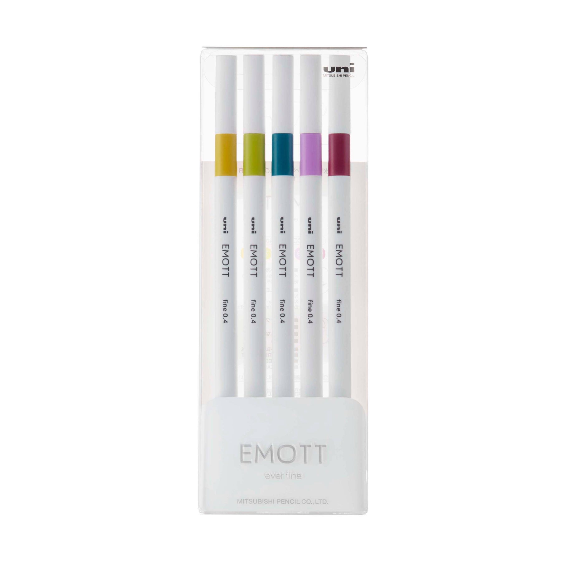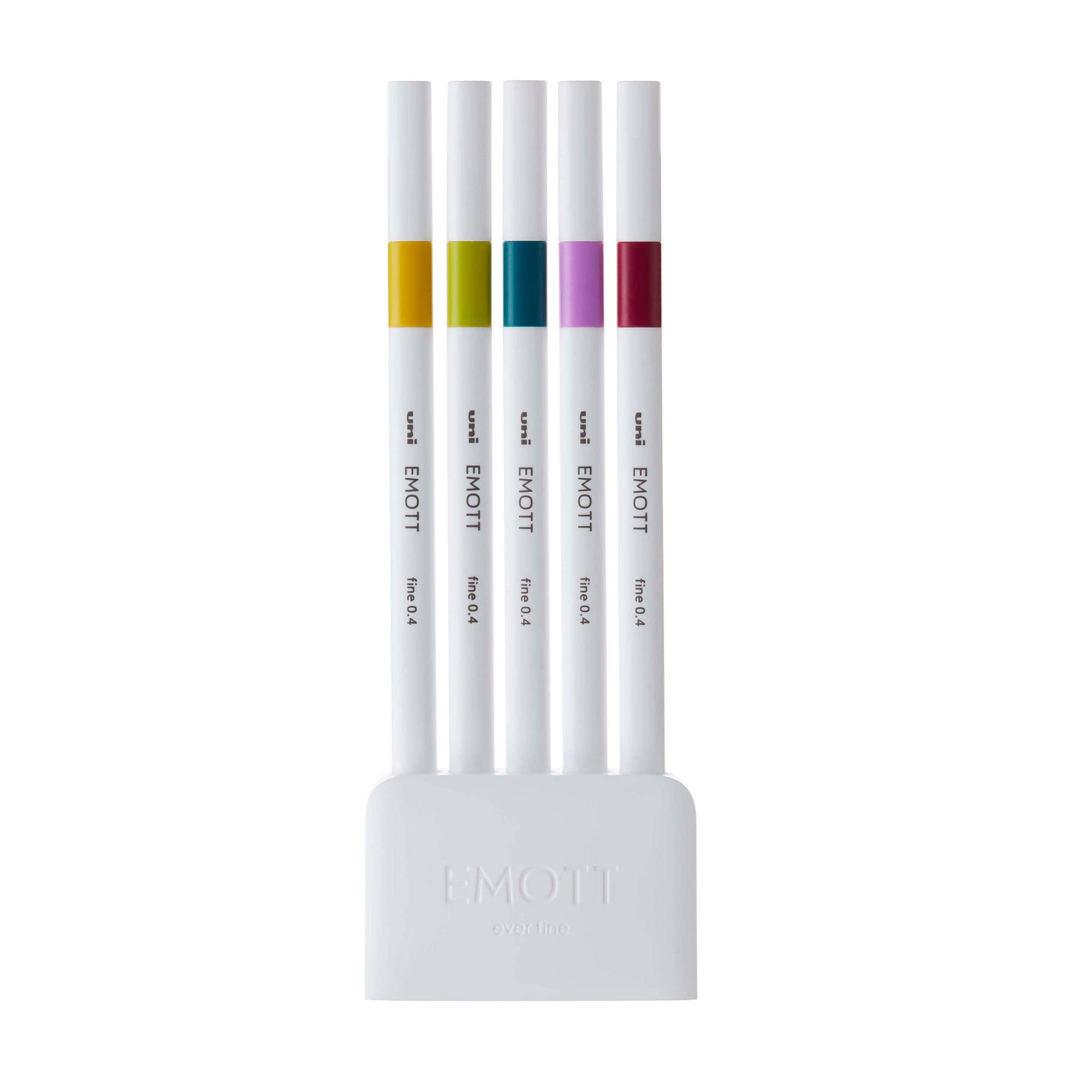 Color coordination and expression has never been easier or more fun! The EMOTT Fineliner is meticulously designed for durability and smooth writing, with a specialized tip that ensures consistent line-width at any angle or pressure. This set features an assortment of colors that evoke a specific mood, season, emotion and style. The Retro Colors set includes straw yellow, apple green, blue green, iris purple and red wine. Enjoy a clear, fine line with excellent color coverage. Ideal for bullet journaling, stationary, hand lettering and note-taking. This set also comes with a stylish stand to store and display your pens, perfect for people who love to enjoy, treasure and showcase their stylish stationery. 0.4mm tips, Sleek white barrels and minimalist design, Durable tips won't bend or split