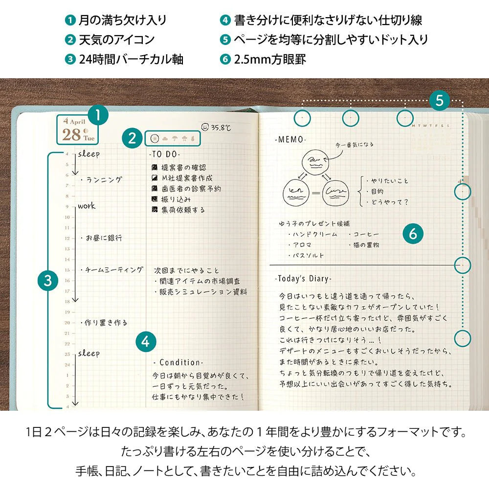 The Diary Hibino from Midori is a "two-page-a-day" A6 size diary with a double-page spread that allows for plenty of writing for each day. This makes it a highly flexible diary that can be used as a notebook, planner, sketchbook and a diary to suit a variety of lifestyles. The textured cover comes in blue-green and camel. It is a perfect diary for keeping important daily records.