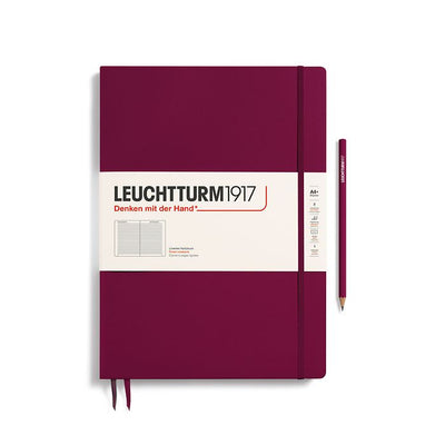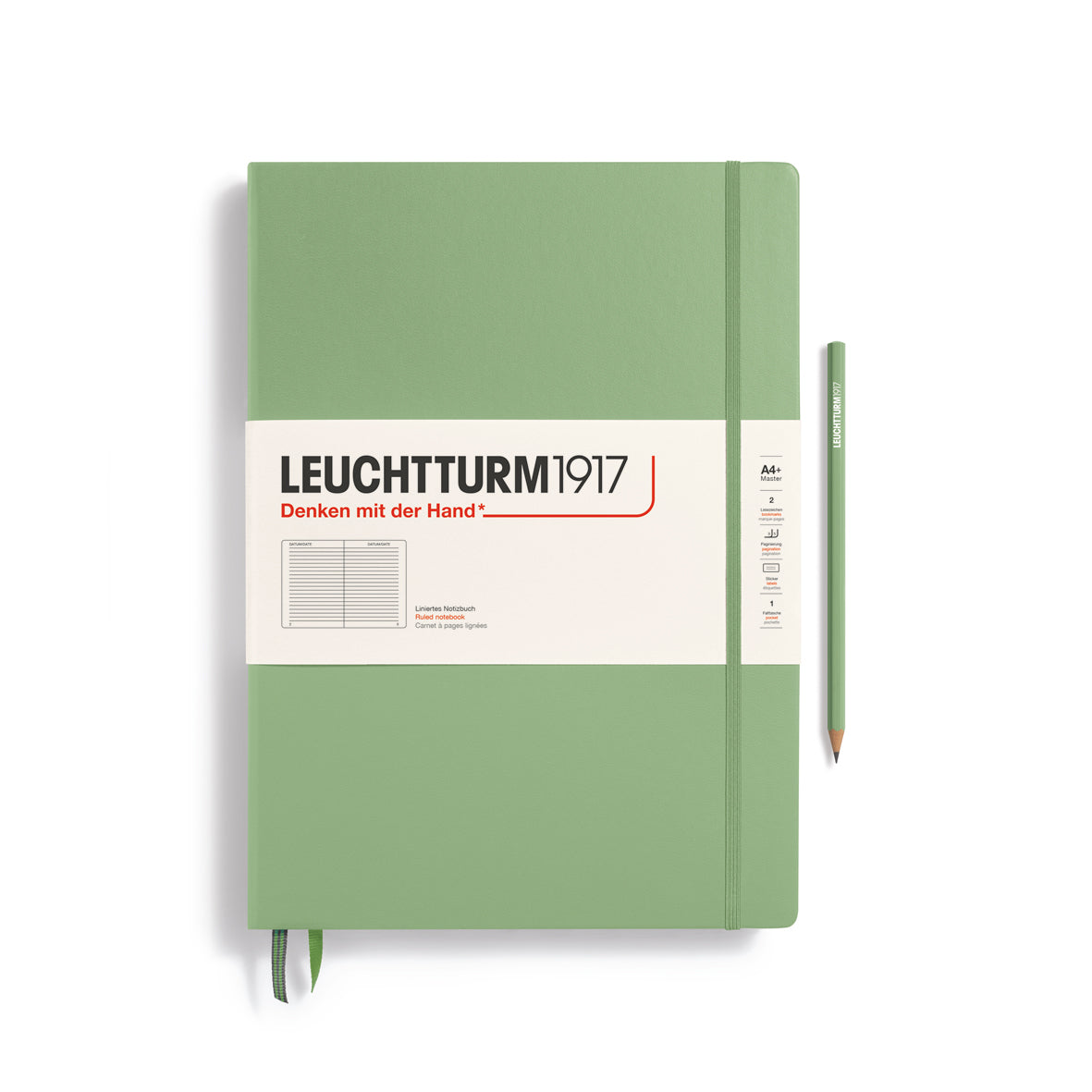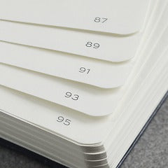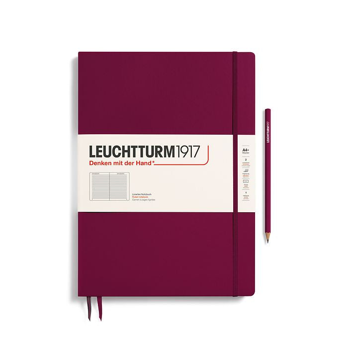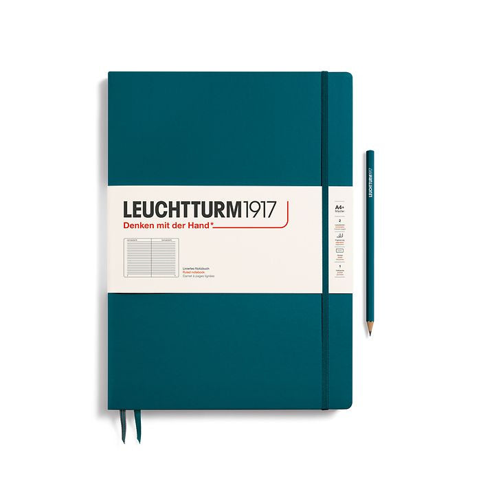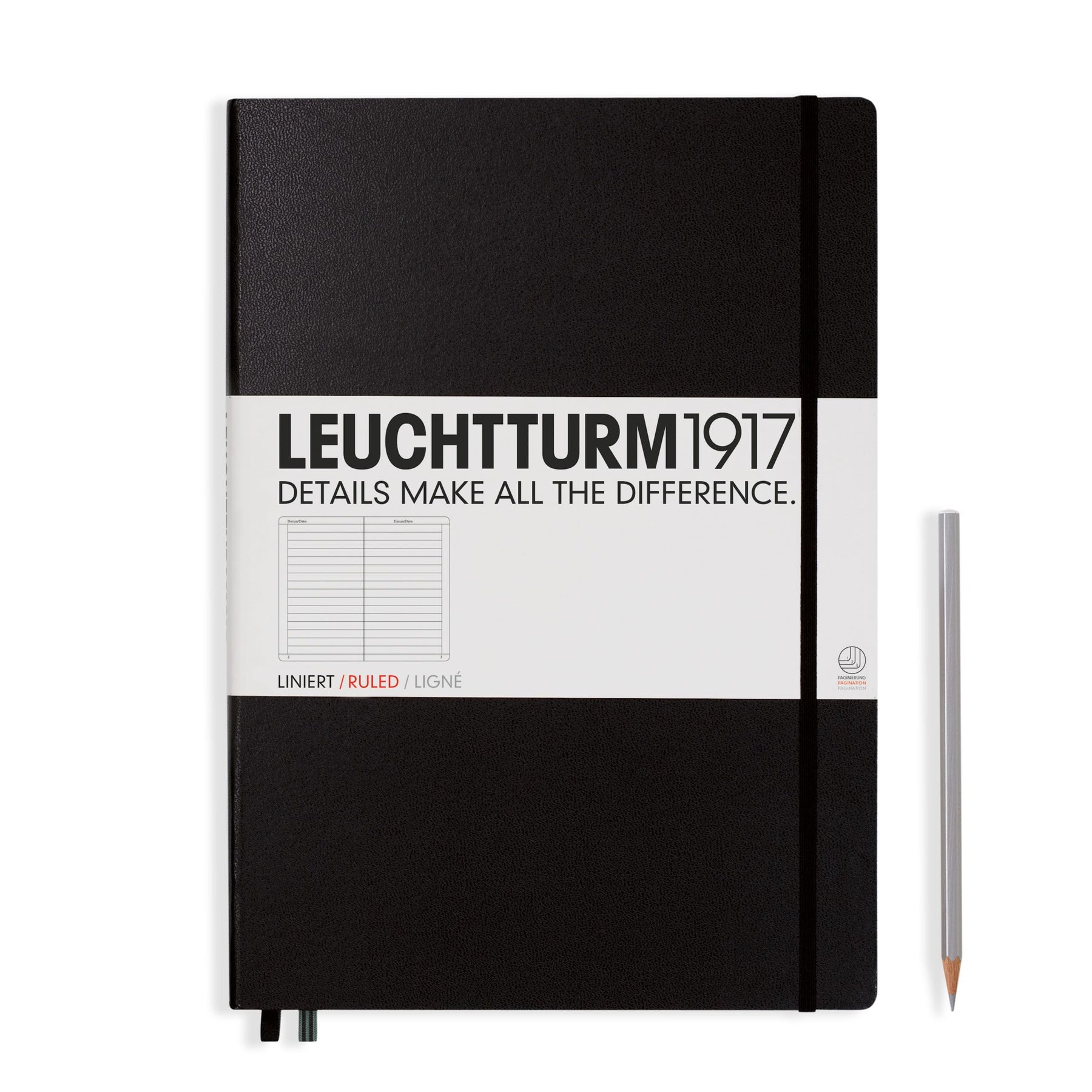 The Master notebook was the first notebook that we produced and we are still very fond of it. With its oversized A4+ format (225 × 315mm), and compared with all smaller formats, it is a master of its class when it comes to order and clarity. The highlight – loose sheets and handouts in A4 format are easily and invisibly stowed away between the pages or in the pocket on the inside of the back cover, just as in a file folder. We offer the Master format with two different thicknesses. As “Classic” edition with 235 numbered pages aThe paper quality of both versions is identical at 100 g/m² and thus significantly heavier than for all other notebooks. Our Master notebooks have a page margin for comments and cross-referencing. The line height for lined Master Classic is 8.5 mm.