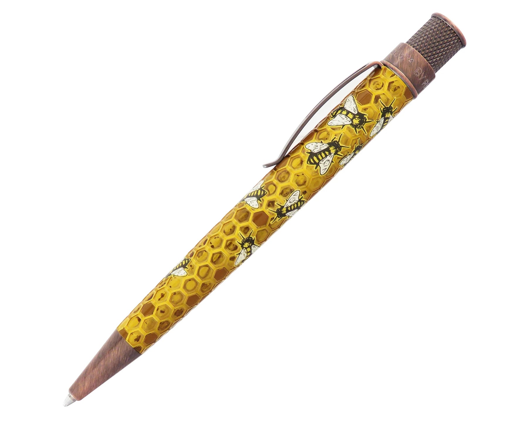 This is one sweet pen! When you pick up this Retro51 BUZZ twist-top ballpoint you will feel the textured honeycomb pattern within the barrel. It’s been lacquered in a honey yellow color and then printed with honey bees and complete with antique copper accents.