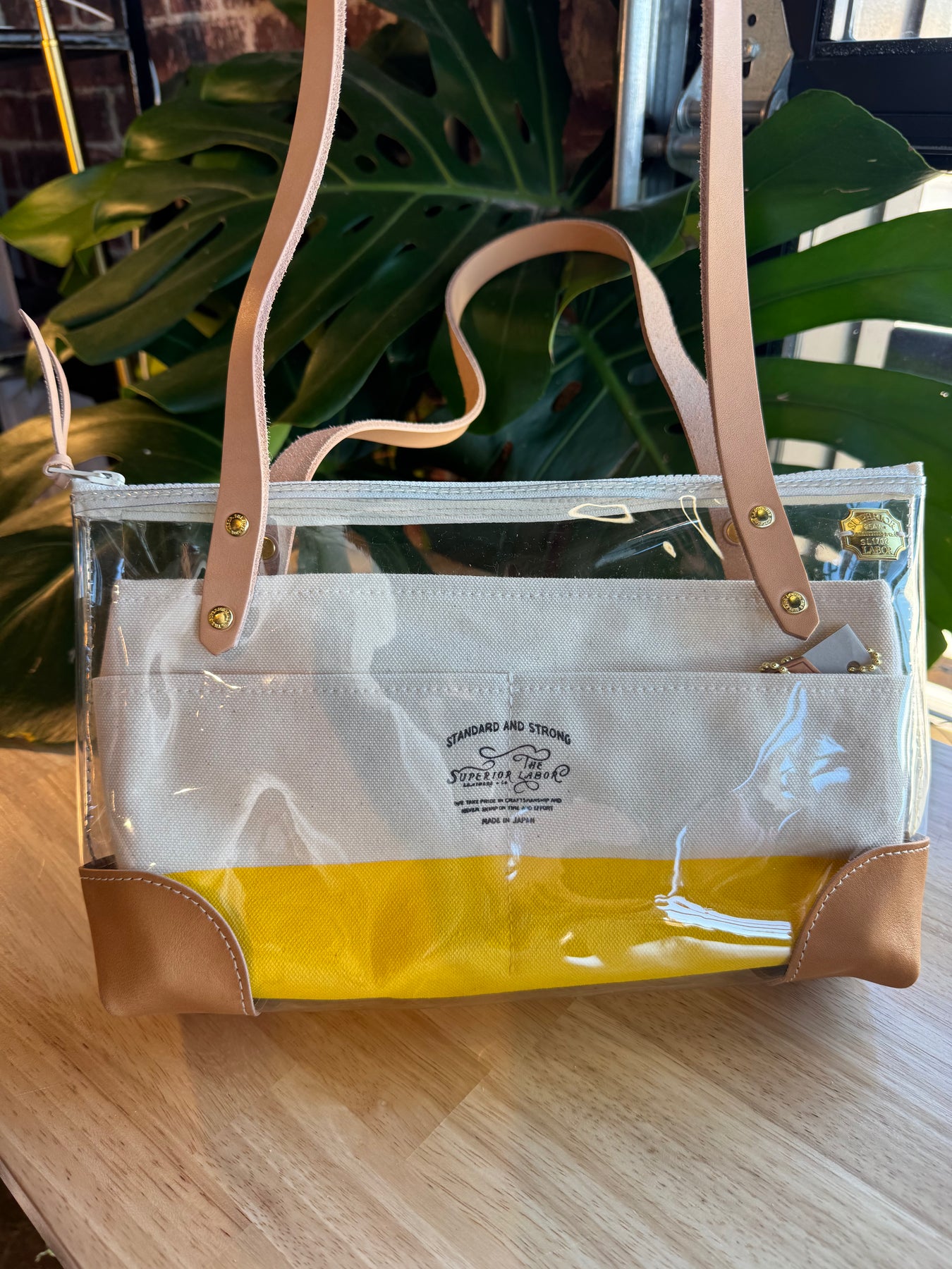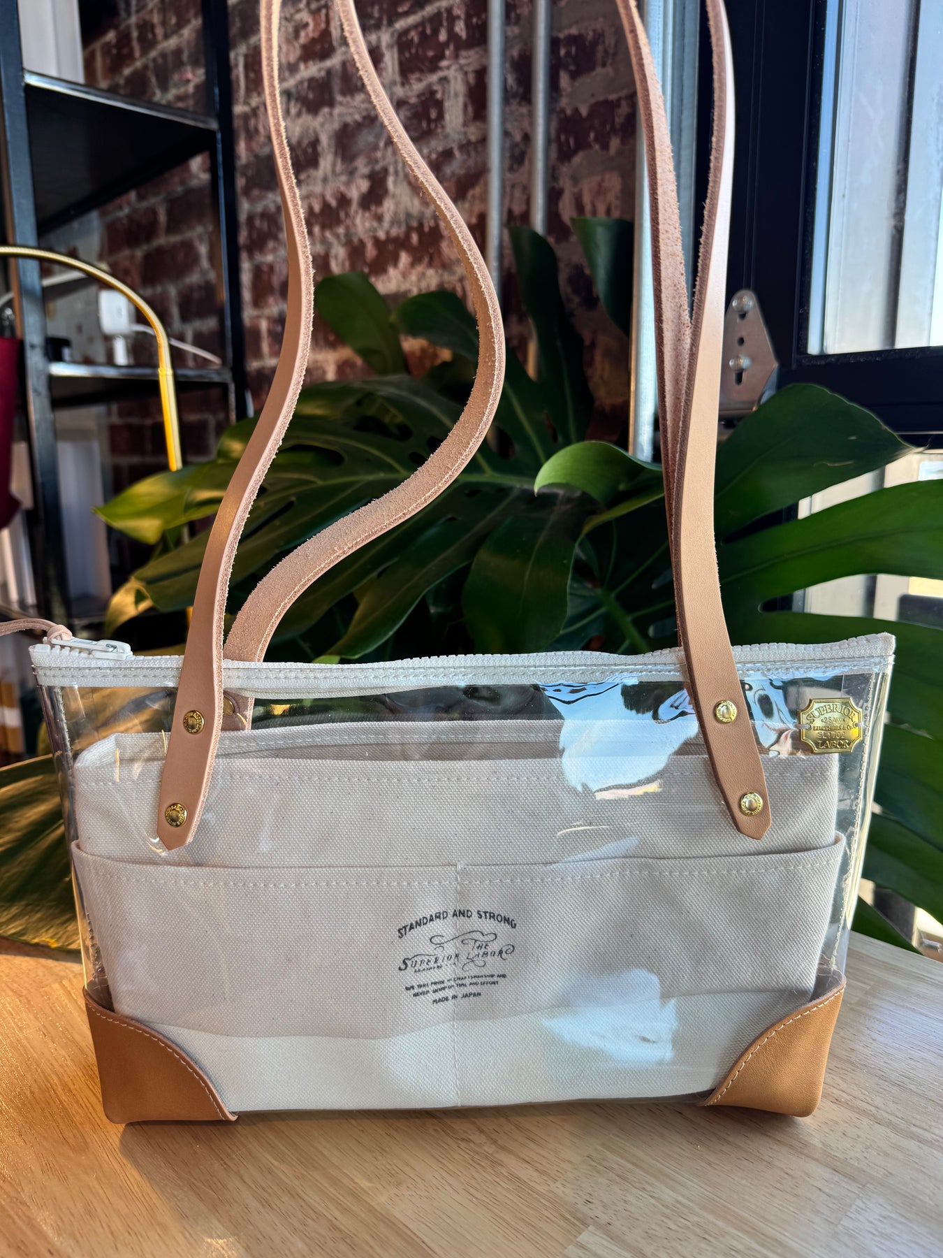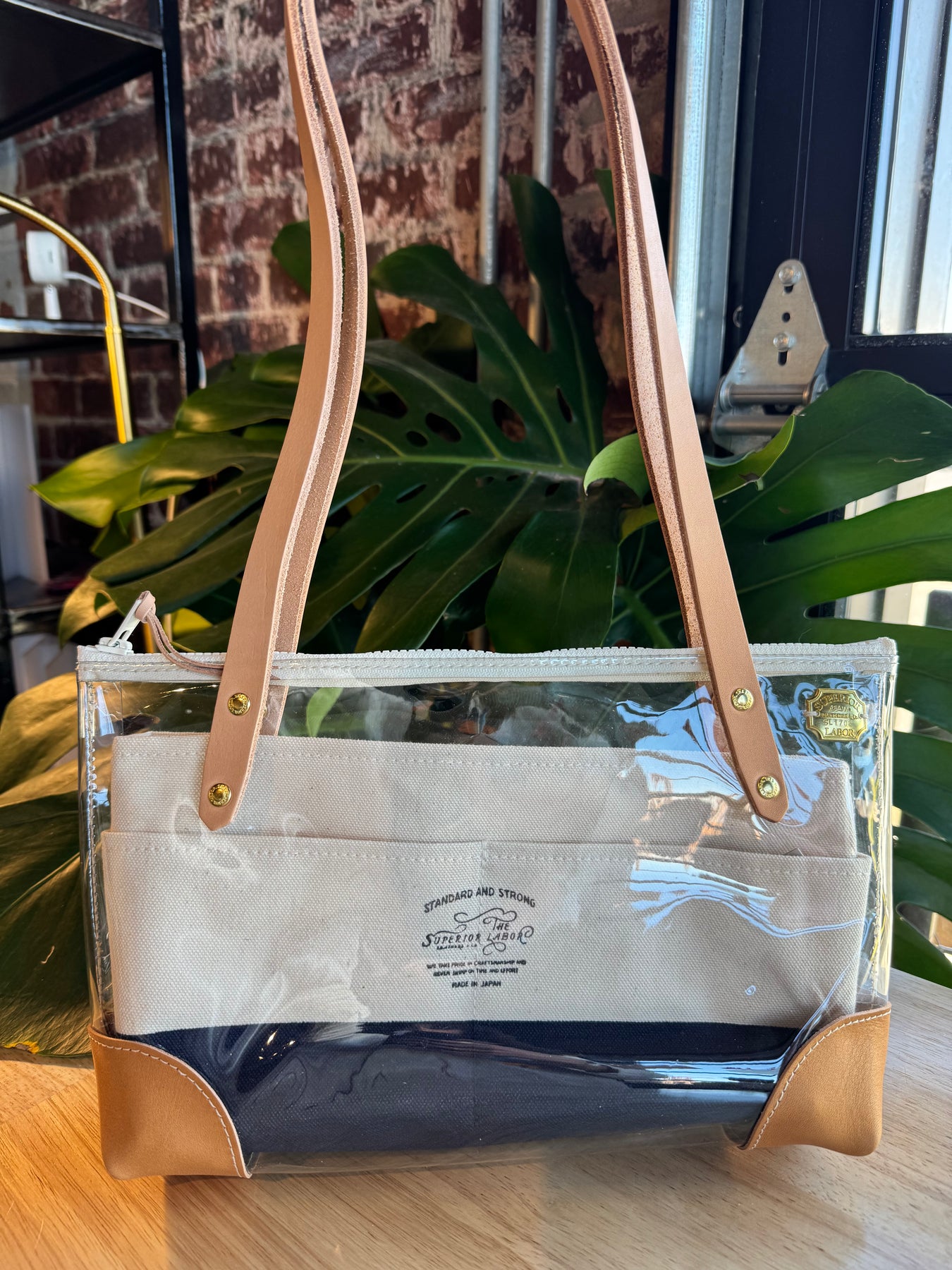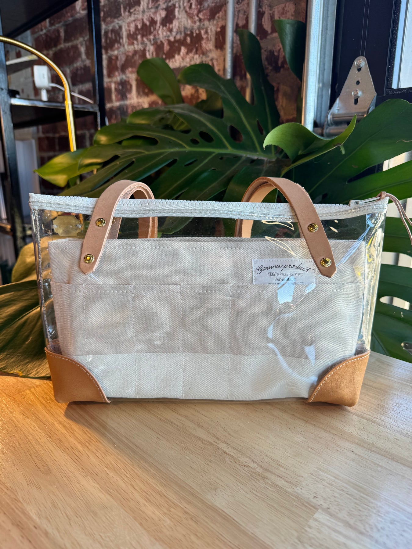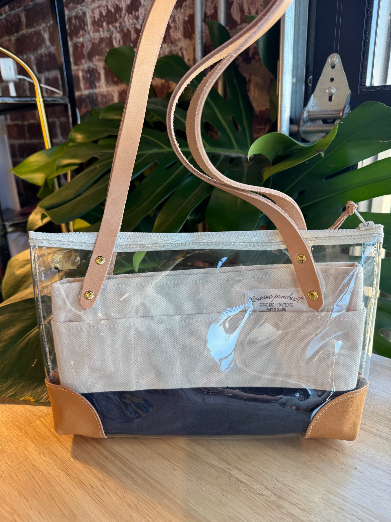 A light and practical shoulder bag made from transparent PVC, accented with leather handles and bottom corners.It comes with a removable canvas inner bag featuring tool pockets—perfect for keeping smaller or private items tucked away, or for organizing your essentials.The base of the inner bag is hand-painted, and you can choose from 10 different color options to suit your style.Put what you want to show on display, and keep the rest hidden inside.Because the bag is transparent, it turns packing into a playful act—balancing visibility and discretion.A fun, slightly addictive bag that invites you to curate what you carry.
