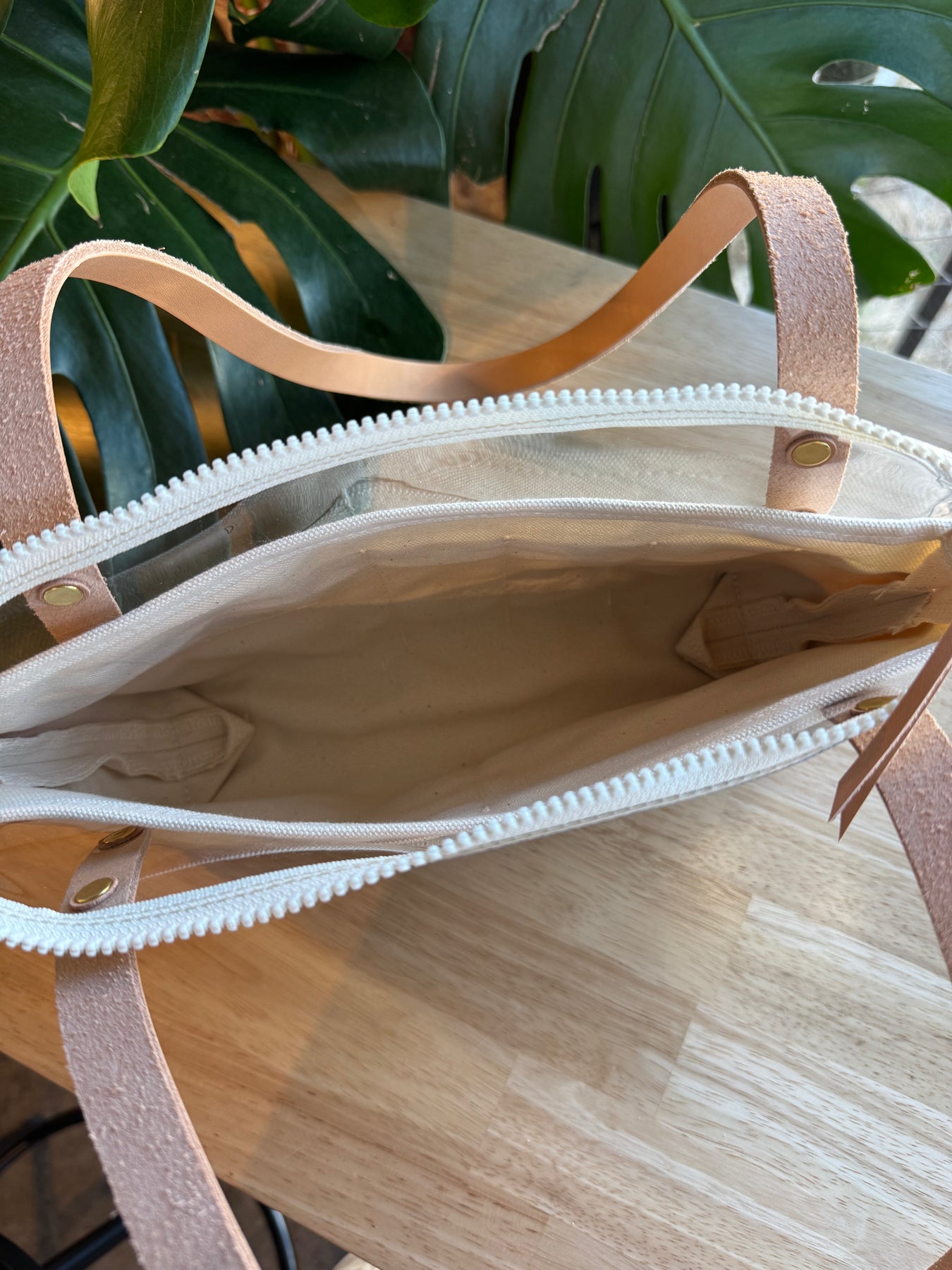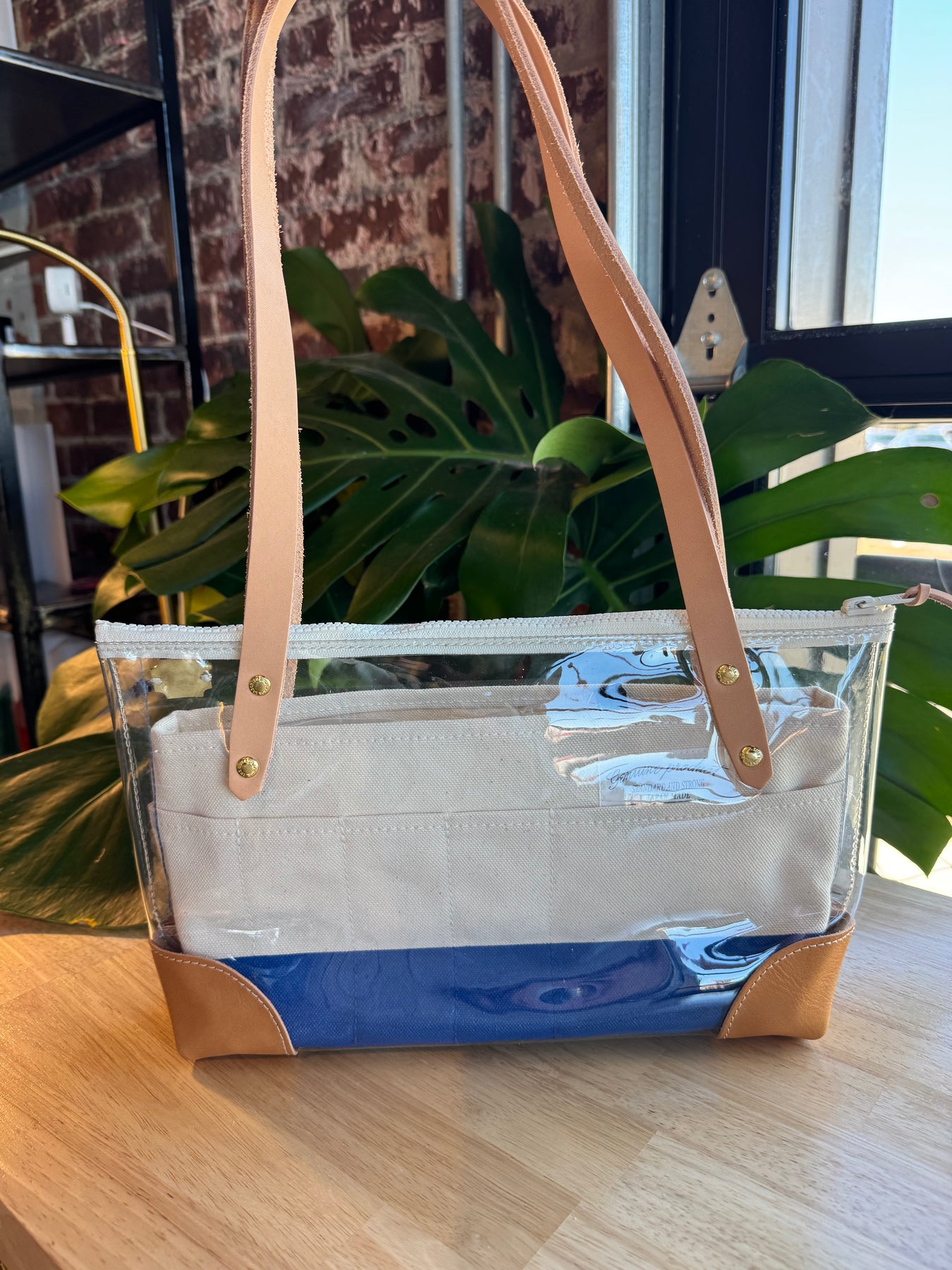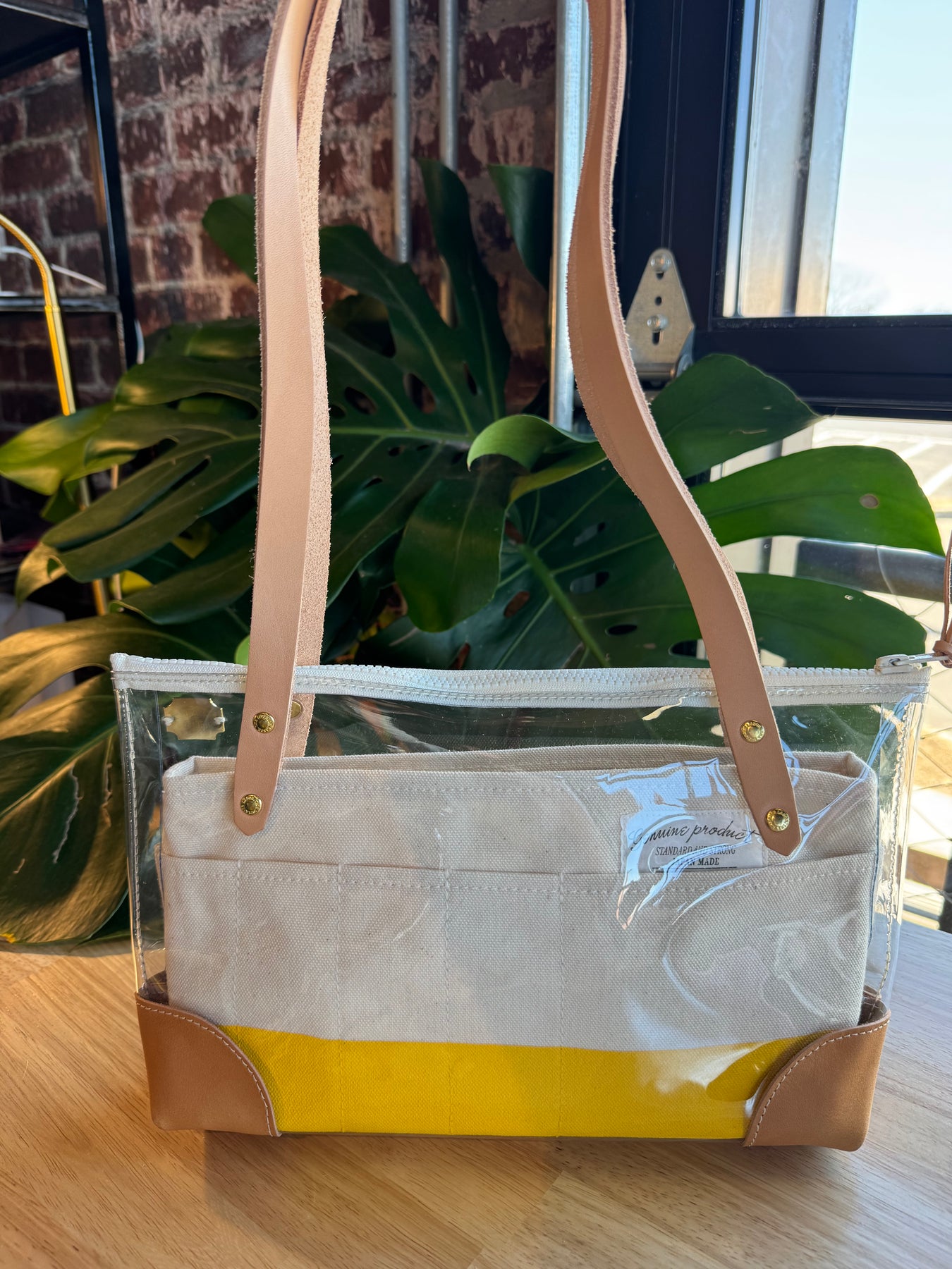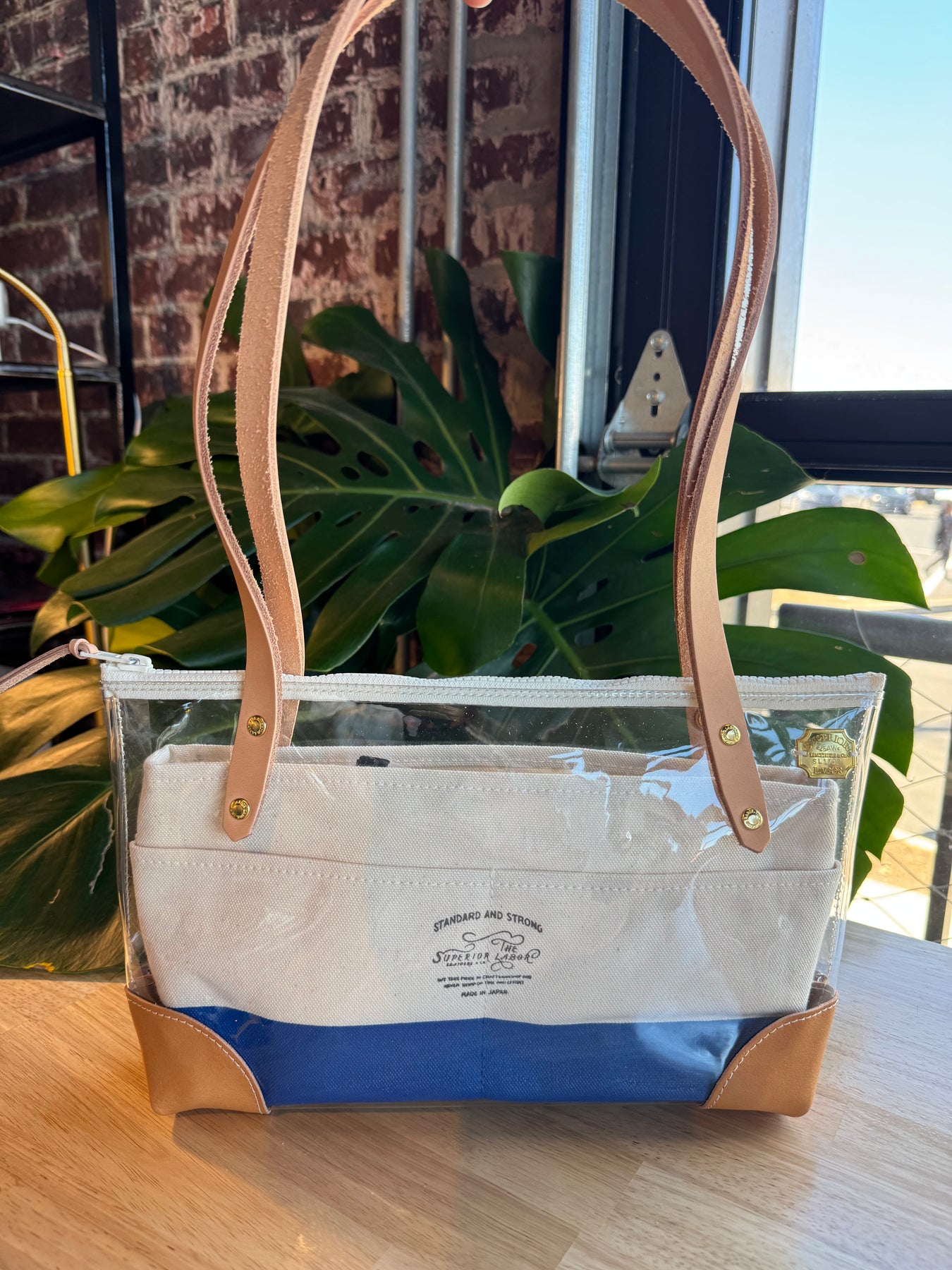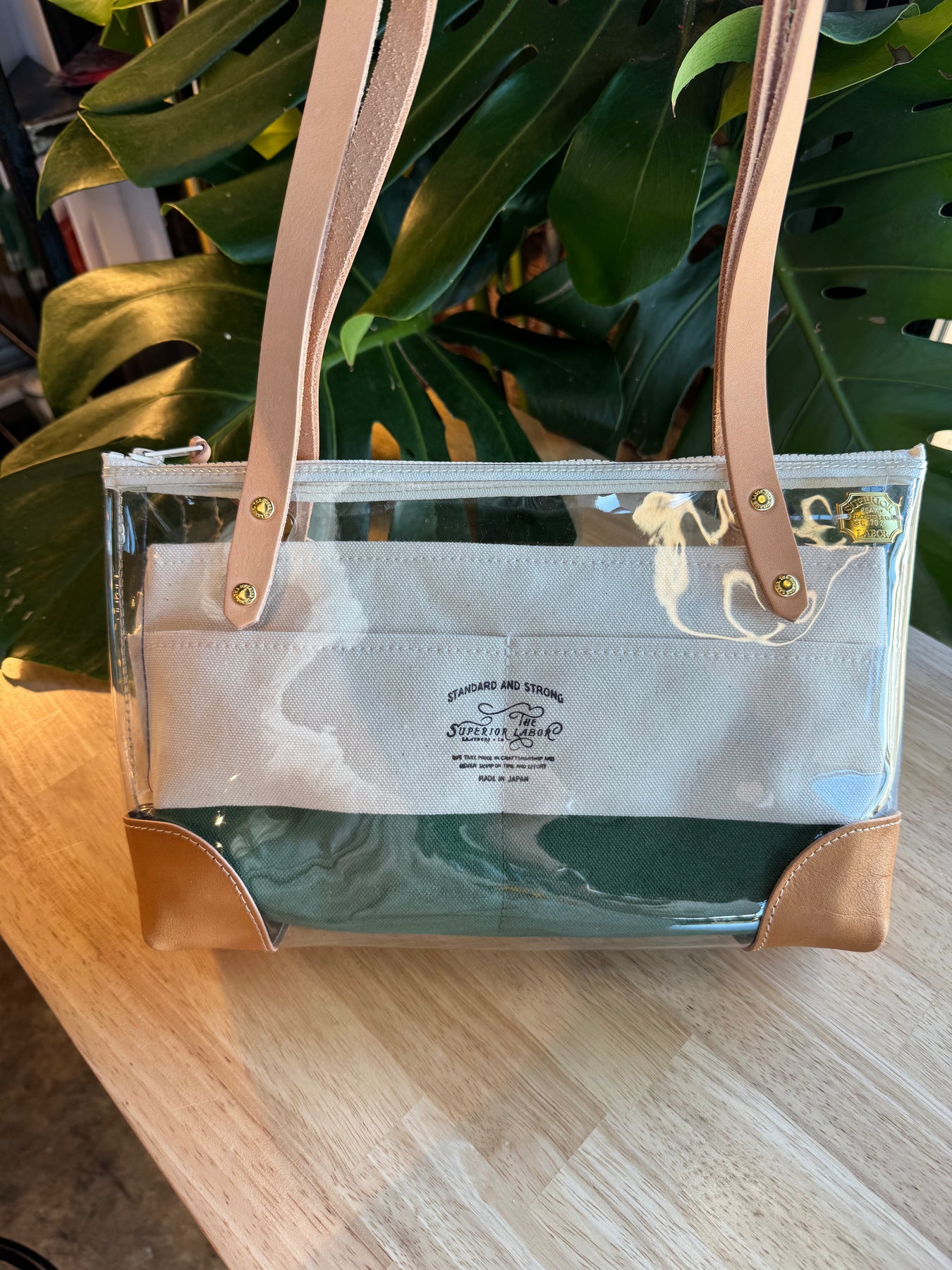 A light and practical shoulder bag made from transparent PVC, accented with leather handles and bottom corners.It comes with a removable canvas inner bag featuring tool pockets—perfect for keeping smaller or private items tucked away, or for organizing your essentials.The base of the inner bag is hand-painted, and you can choose from 10 different color options to suit your style.Put what you want to show on display, and keep the rest hidden inside.Because the bag is transparent, it turns packing into a playful act—balancing visibility and discretion.A fun, slightly addictive bag that invites you to curate what you carry.