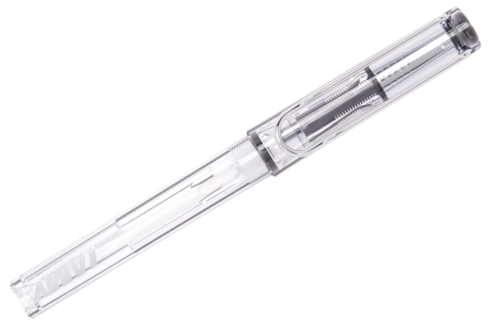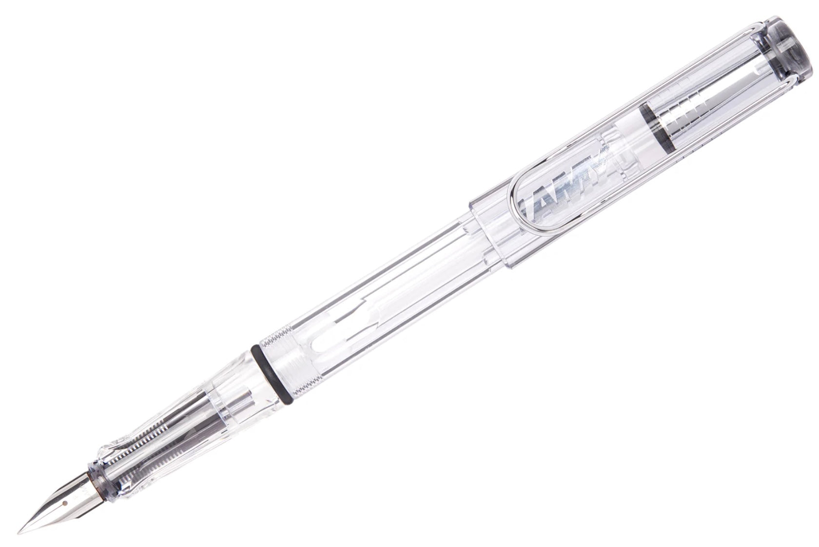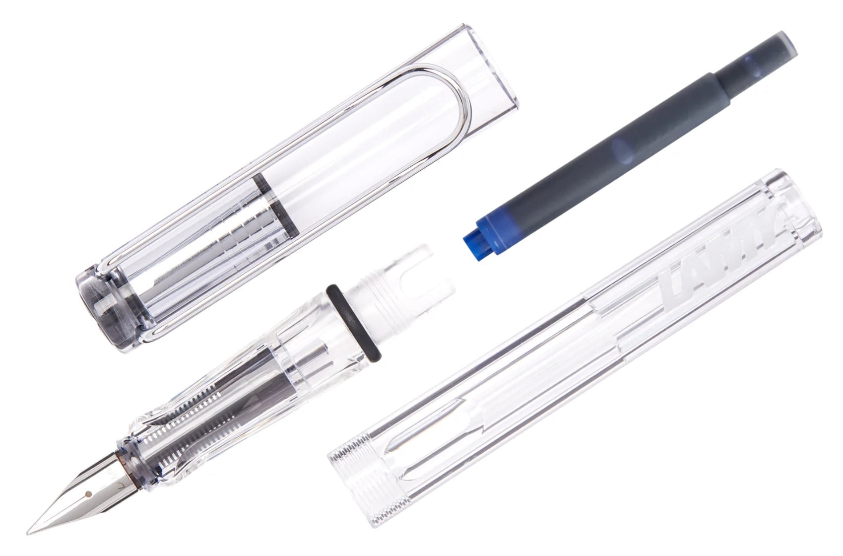 This clear demonstrator LAMY vista fountain pen, essentially the clear version of the LAMY safari, has silver trim and an interchangeable silver steel nib. It features a triangular grip for proper hand position when writing. It comes with a blue LAMY ink cartridge to get you started writing right away.