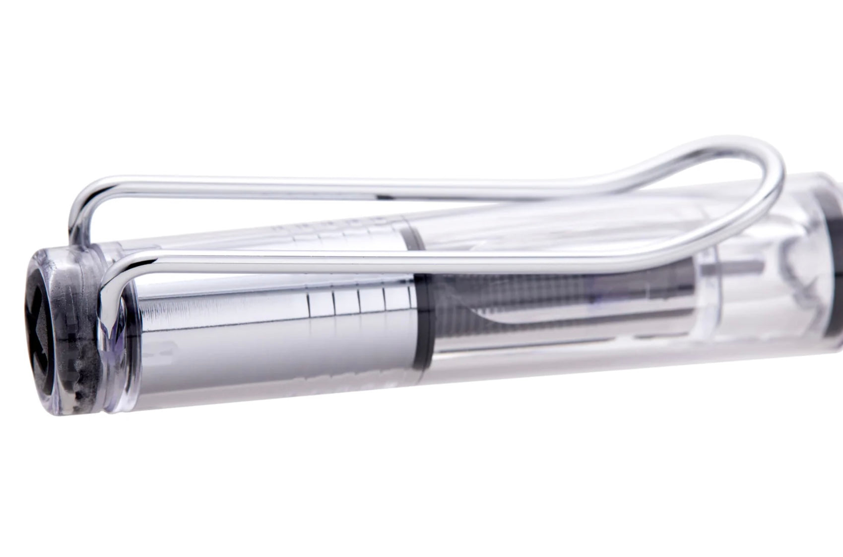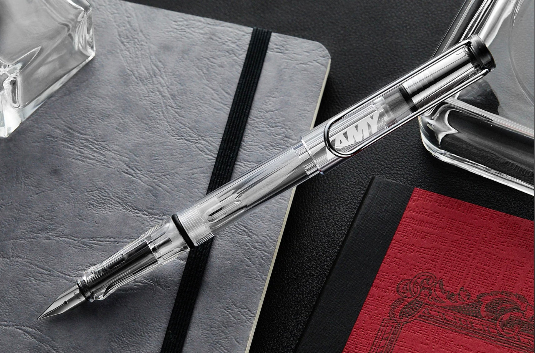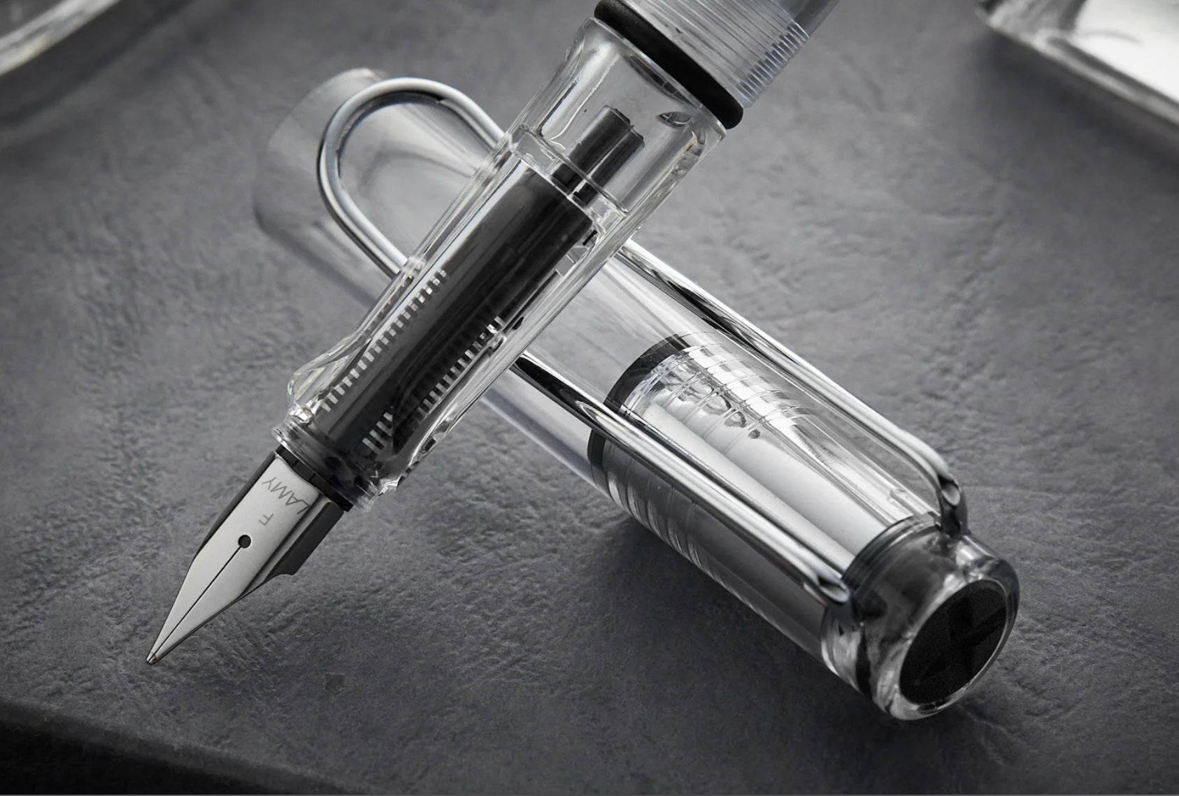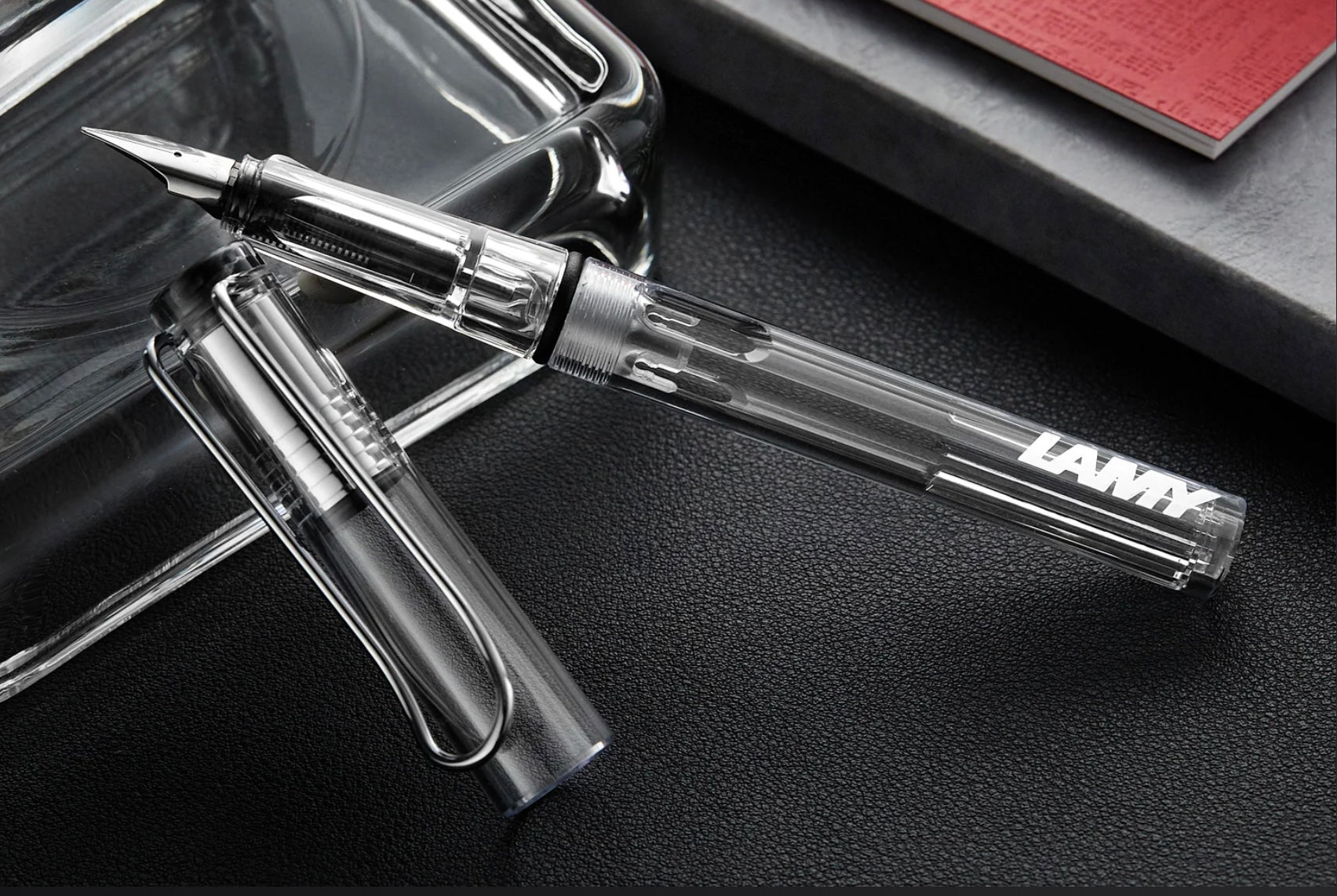 This clear demonstrator LAMY vista fountain pen, essentially the clear version of the LAMY safari, has silver trim and an interchangeable silver steel nib. It features a triangular grip for proper hand position when writing. It comes with a blue LAMY ink cartridge to get you started writing right away.